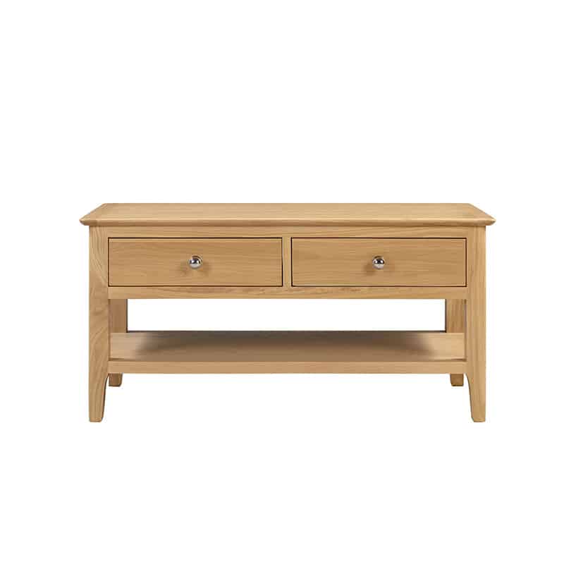 Crafted from solid oak and oak veneers, the Cotswold Coffee Table features 2 Drawers and a spacious shelf for keeping your essentials organised. This simple, yet stylish design is an ideal additional to any traditional living room with its soft edges and charming round silver knobs. Part of the Julian Bowen Cotswold Dining & Occasional Collection.