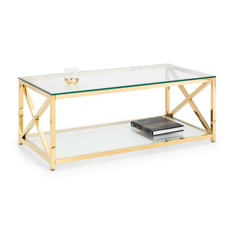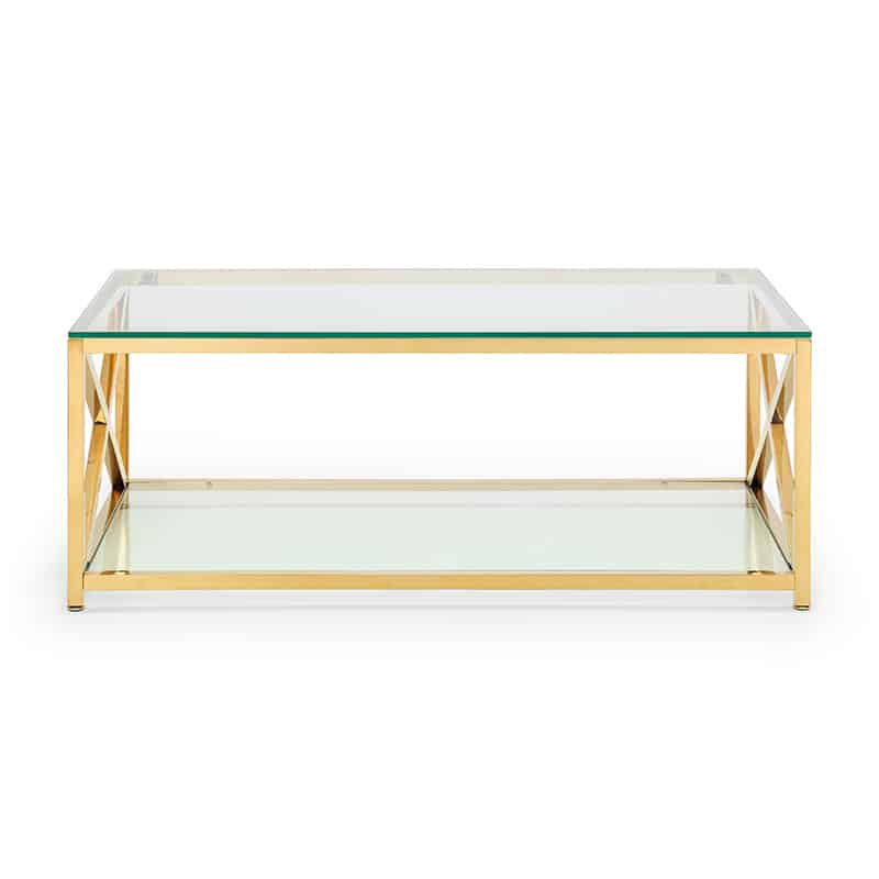The lavish Miami occasional collection will add a touch of class and luxury to any home. Taking inspiration from the Art Deco period, the Miami features a striking cross frame design. Crafted from a gold finished frame and tempered glass, this coffee table provides a shelf underneath for additional storage.