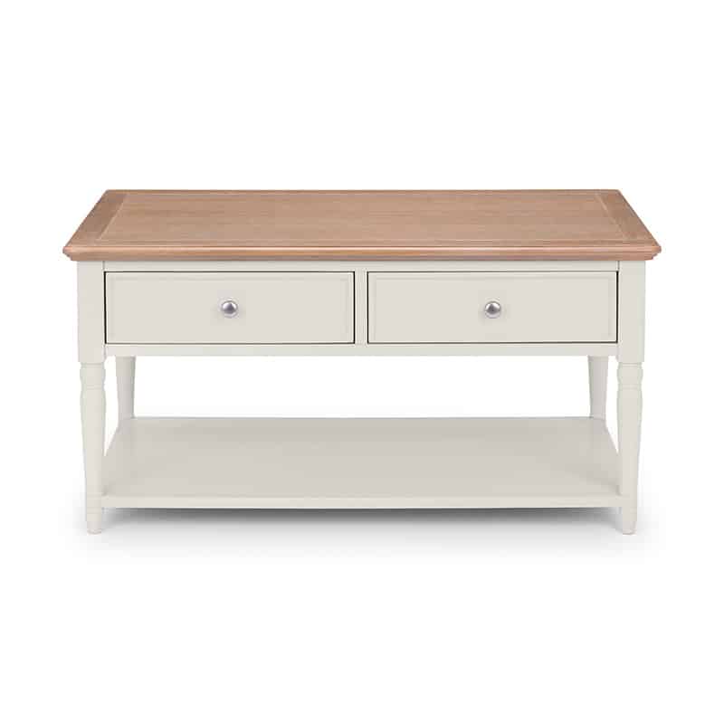 This timeless coffee table offers an authentic antique design with a classic turned leg detail perfect for contemporary spaces as well as traditional homes. Finished in a grey lacquer with a limed oak effect top, the Provence features additional storage with 2 drawers, perfect for storing coasters and magazines. Part of the Provence dining and occasional collection, this dining table becomes a stunning set when paired with the Provence dining chairs.