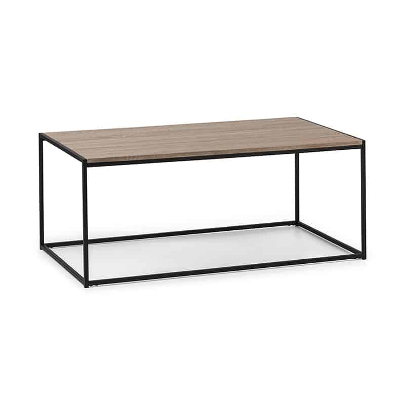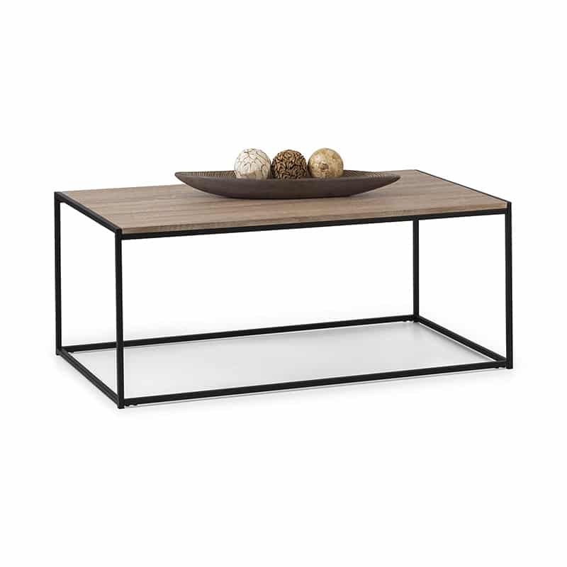 A cool, modern coffee table designed to add a contemporary touch to any home or work place. Its simple clean lines, delineated by a subtle, black coated metal frame are complemented perfectly by a warm, sonoma oak foil, to create a very stylish and sleek product.