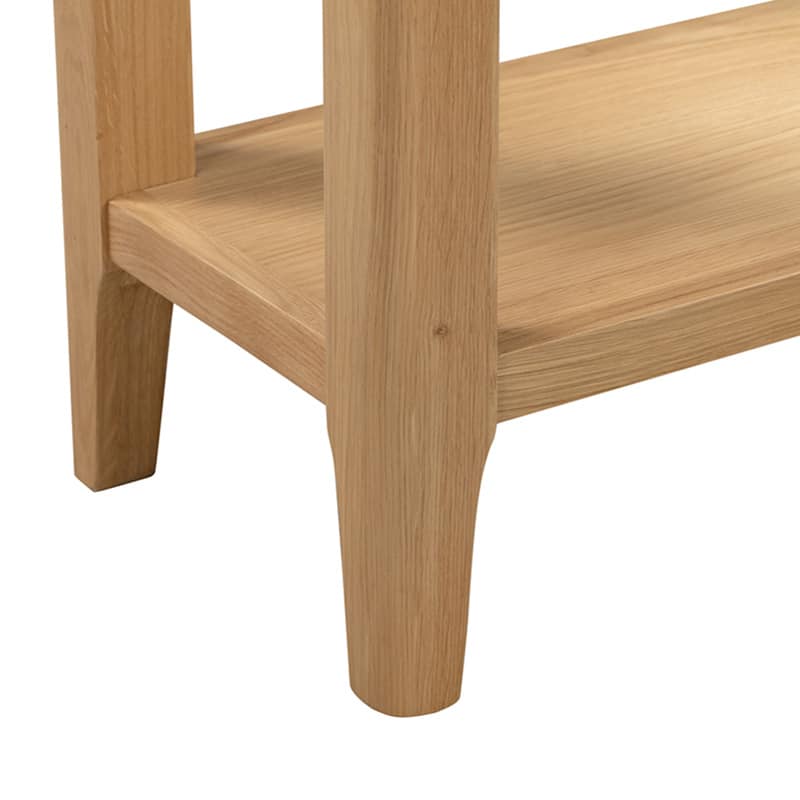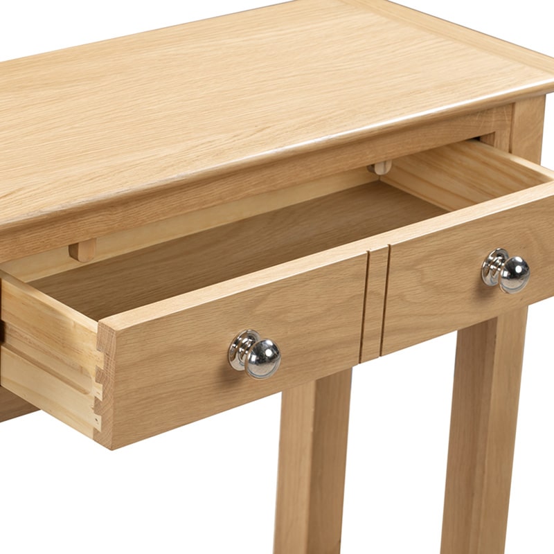 Crafted from solid oak and oak veneers, the Cotswold Console Table features 2 Drawers and a spacious shelf for storing your keys or winter warmers. This simple, yet stylish design is an ideal additional to any traditional living room with its soft edges and charming round silver knobs. Part of the Julian Bowen Cotswold Dining & Occasional Collection.