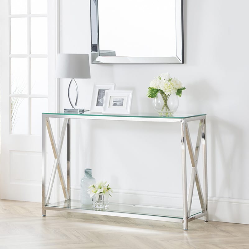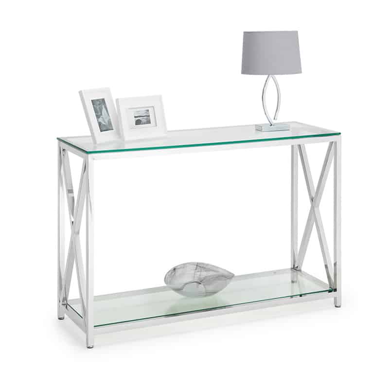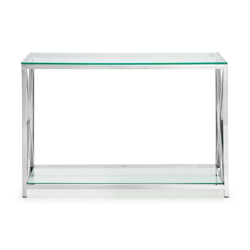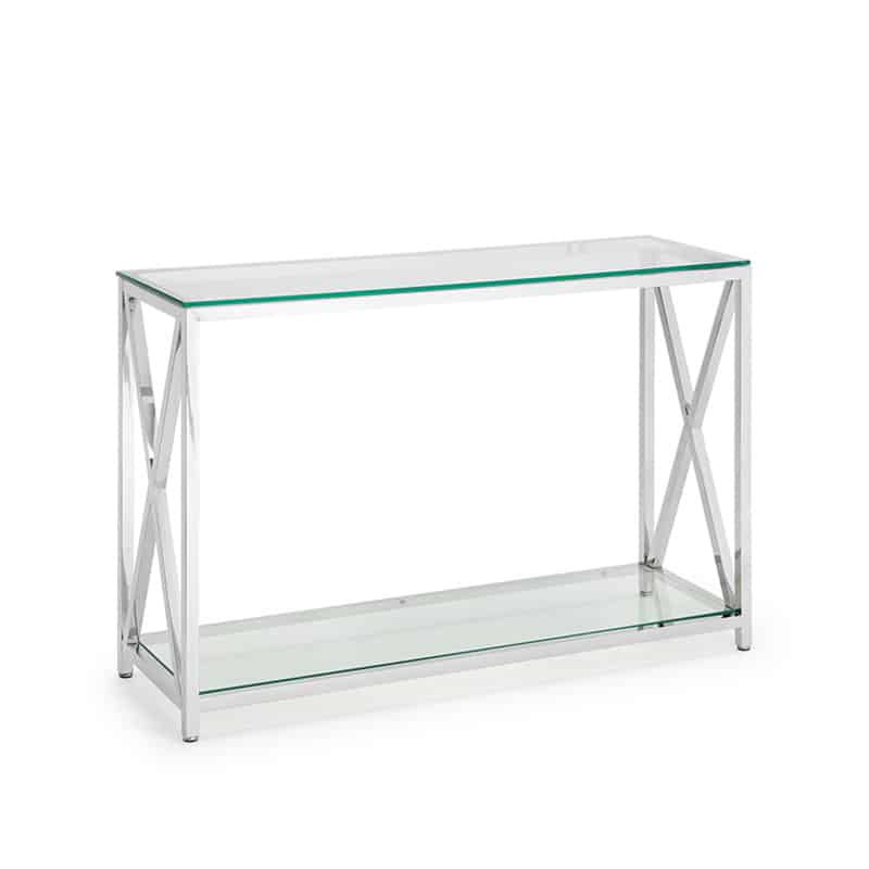The lavish Miami occasional collection will add a touch of class and luxury to any home. Taking inspiration from the Art Deco period, the Miami features a striking cross frame design. Crafted from a chrome frame and tempered glass, this console table provides a shelf underneath for additional storage.