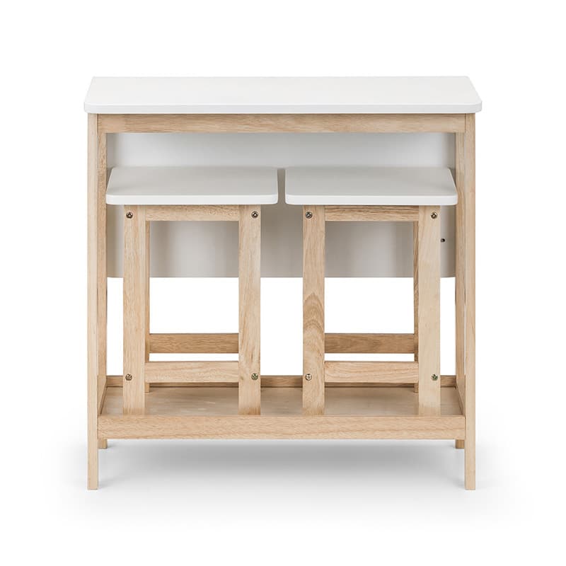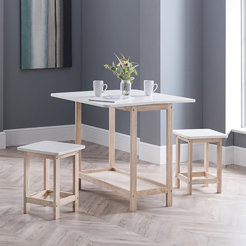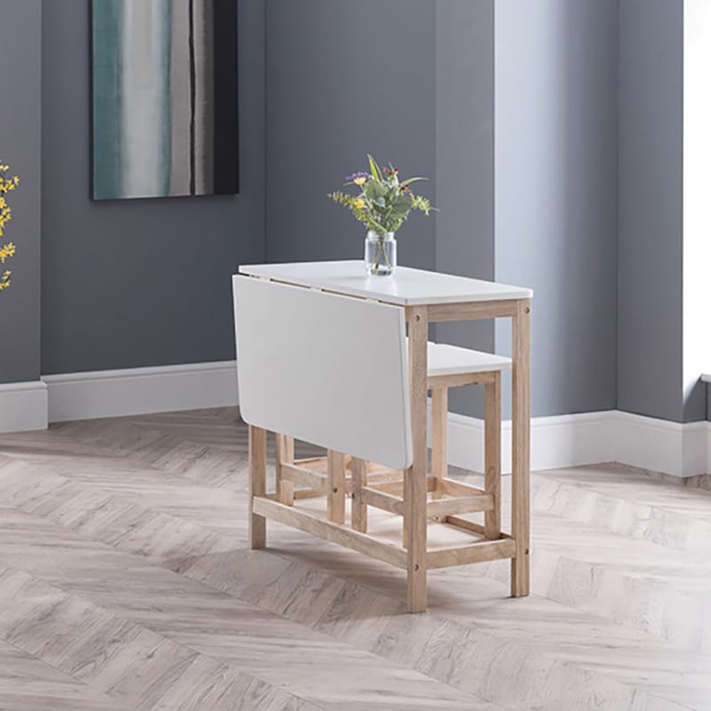 The Bergen Bar set is ideal for smaller kitchen and dining areas with limited space. The two stools sit neatly on the bottom shelf, whilst the table top is fixed on wooden runners allowing the top to slide toward you and fold down. This space saving design means the dining set can be stored out of the way at ease when not in use. The two-tone combination of white and natural creates a mixture of modern and country style, perfect for a wide range of décor.