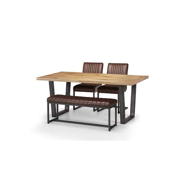 Made from solid oak, this dining table offers a rustic finish emphasising the stunning natural wood grain. The Brooklyn Dining Table offers a vintage edge featuring industrial trapeze style metal legs. This spacious table can seat up to 6 people, perfect for a wide range of modern decor. Featured with the Brooklyn upholstered bench and 2 Brooklyn chairs. Upholstered in a vintage brown faux leather finish, this upholsteresd bench and chairs offer a stunning retro design with a vintage edge featuring industral and cantilever style gunmetal frames. This spacious bench can seat up to 2 people.