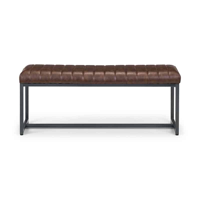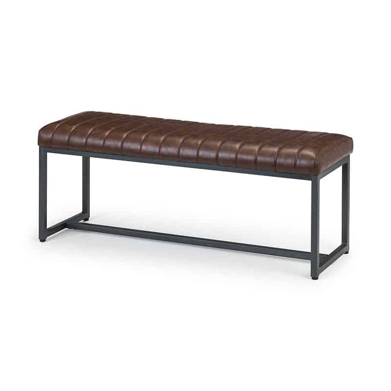 - Brown faux leather finish with a gunmetal leg frame