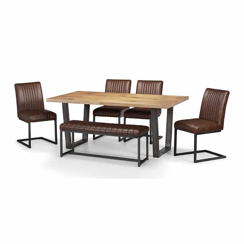 Made from solid oak, this dining table offers a rustic finish emphasising the stunning natural wood grain. The Brooklyn Dining Table offers a vintage edge featuring industrial trapeze style metal legs. This spacious table can seat up to 6 people, perfect for a wide range of modern decor. Featured with the Brooklyn upholstered bench and 4 Brooklyn chairs. Upholstered in a vintage brown faux leather finish, this upholsteresd bench and chairs offer a stunning retro design with a vintage edge featuring industral and cantilever style gunmetal frames. This spacious bench can seat up to 2 people.