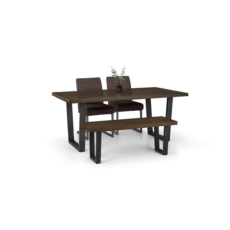 Made from solid oak, this dining table offers a rustic dark oak finish emphasising the stunning natural wood grain. The Brooklyn Dining Table offers a vintage edge featuring industrial trapeze style metal legs. This spacious table can seat up to 6 people, perfect for a wide range of modern decor. Part of the Julian Bowen Brooklyn Dining and Occasional Collection. Accompanied by matching bench and 2 Brooklyn Charcoal Dining Chairs with an industrial, retro design in a grey faux leather finish with a cantilever style gunmetal leg frame.