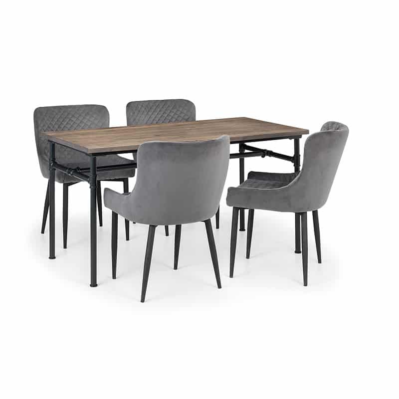 The Carnegie Dining Table offers an industrial design, perfect for your kitchen, dining room and other interior space. The use of solid Elm wood in a mocha finish adds a distinctive statement look, whilst beautifully showing off the wood grain. Finished with powder-coated steel legs in a pipework style, the Carnegie is sure to be an eye-catching piece in any room. This set includes a Carnegie Dining Table and 4 Luxe Grey Dining Chairs.