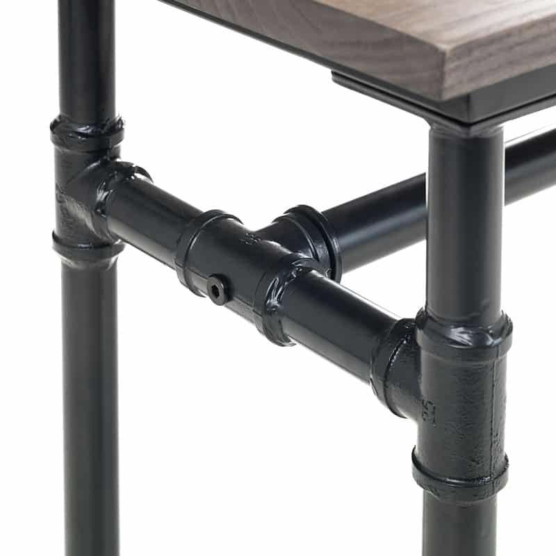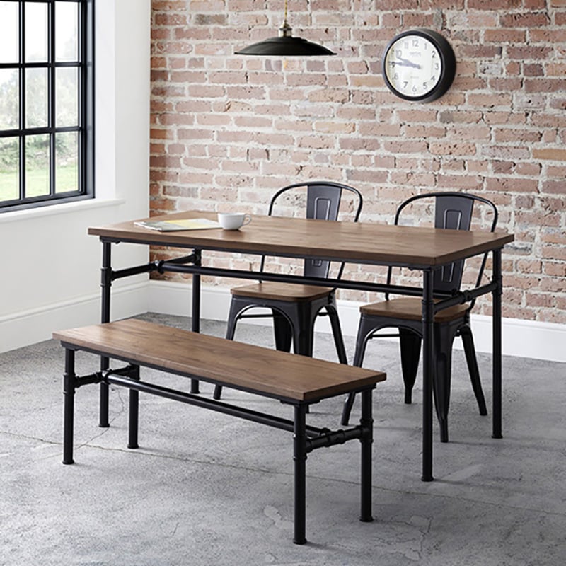 The Carnegie Dining Table offers an industrial design, perfect for your kitchen, dining room and other interior space. The use of solid Elm wood in a mocha finish adds a distinctive statement look, whilst beautifully showing off the wood grain. Finished with powder-coated steel legs in a pipework style, the Carnegie is sure to be an eye-catching piece in any room. This set includes a Carnegie Dining Table, Bench and 2 Grafton Dining Chairs.
