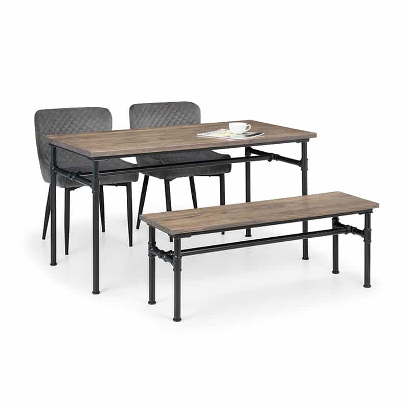 The Carnegie Dining Table offers an industrial design, perfect for your kitchen, dining room and other interior space. The use of solid Elm wood in a mocha finish adds a distinctive statement look, whilst beautifully showing off the wood grain. Finished with powder-coated steel legs in a pipework style, the Carnegie is sure to be an eye-catching piece in any room. This set includes a Carnegie Dining Table, Bench and 2 Luxe Grey Dining Chairs.