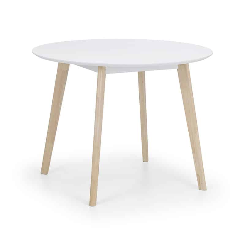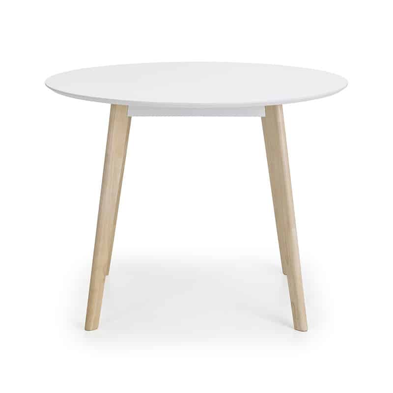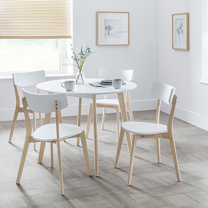 A timeless retro design reflecting the style of the 1950’s. The Casa round dining set has a durable white lacquered top and seat pad with limed oak effect legs. Crafted from solid Malaysian hardwood and MDF ensuring long lasting durability. This set includes a round table and 4 dining chairs.