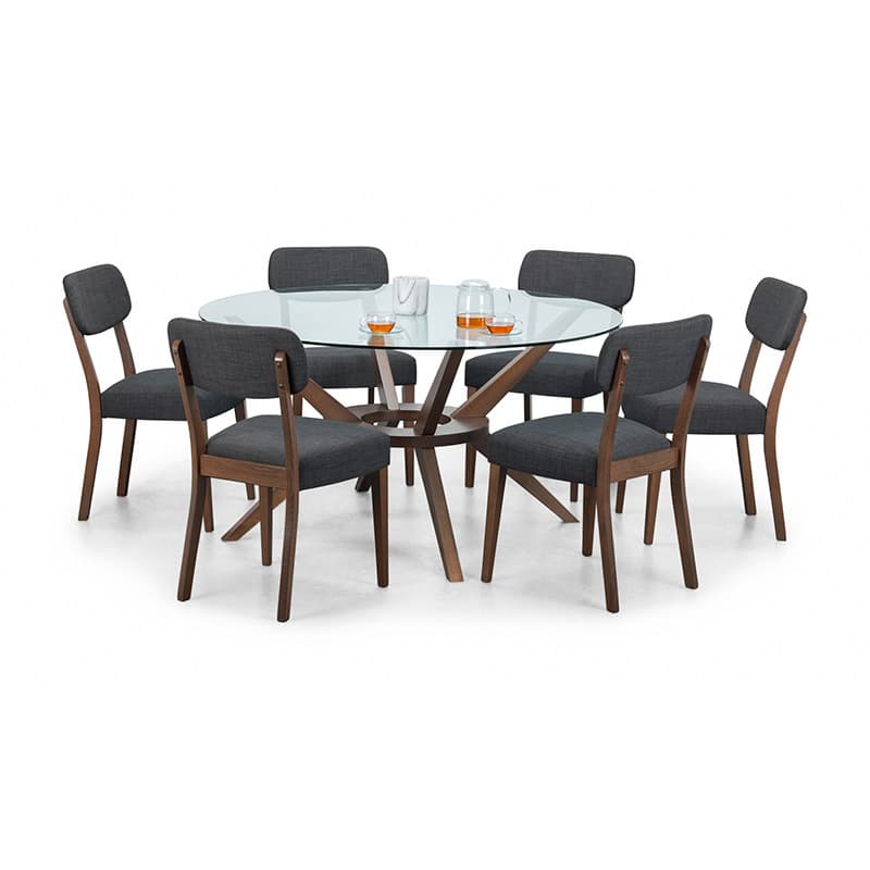 A truly stunning 140cm circular dining table featuring an elegantly styled solid wood base in walnut finish, topped with a substantial tempered glass top to create an exquisite contemporay piece that will take pride of place in any home. Featured with 6 Farringdon dining chairs. Offering hints of retro and Scandinavian designs, the Farringdon dining chair brings a touch of mid-century sophistication through a fashionable combination of shapes and forms. Upholstered in a grey linen fabric, this dining chair features an open back seat finished with a rich walnut frame.