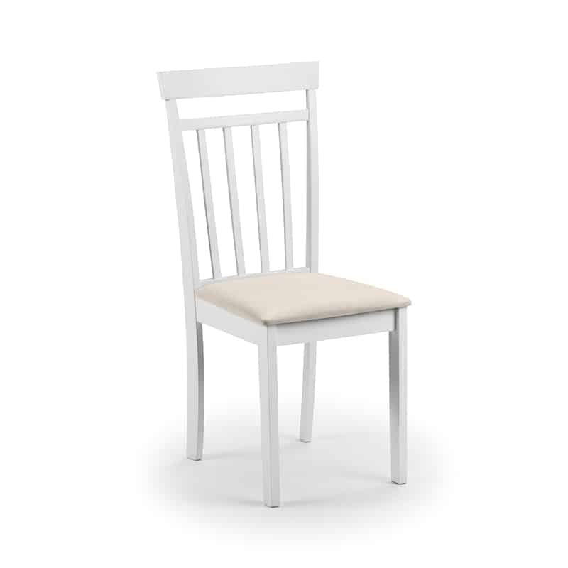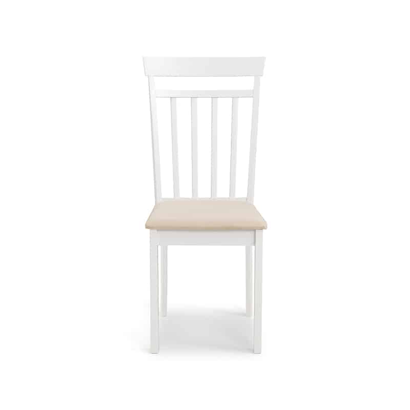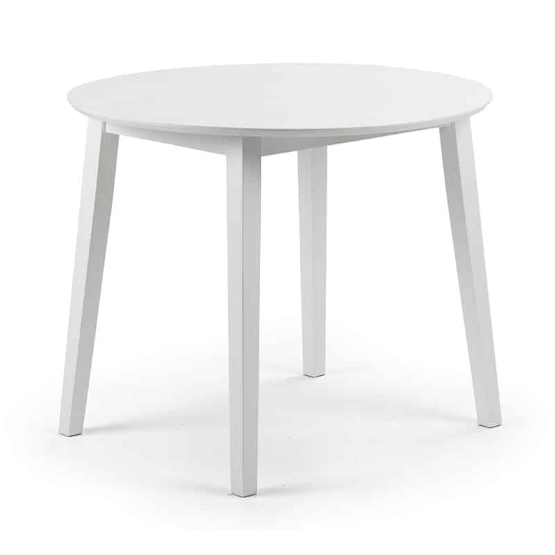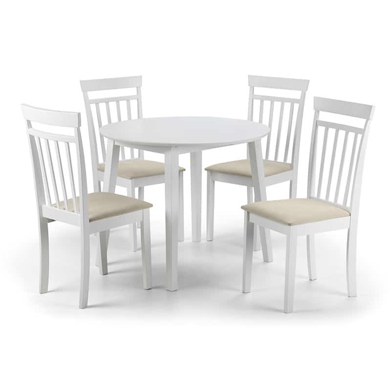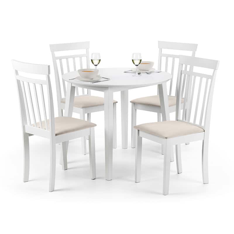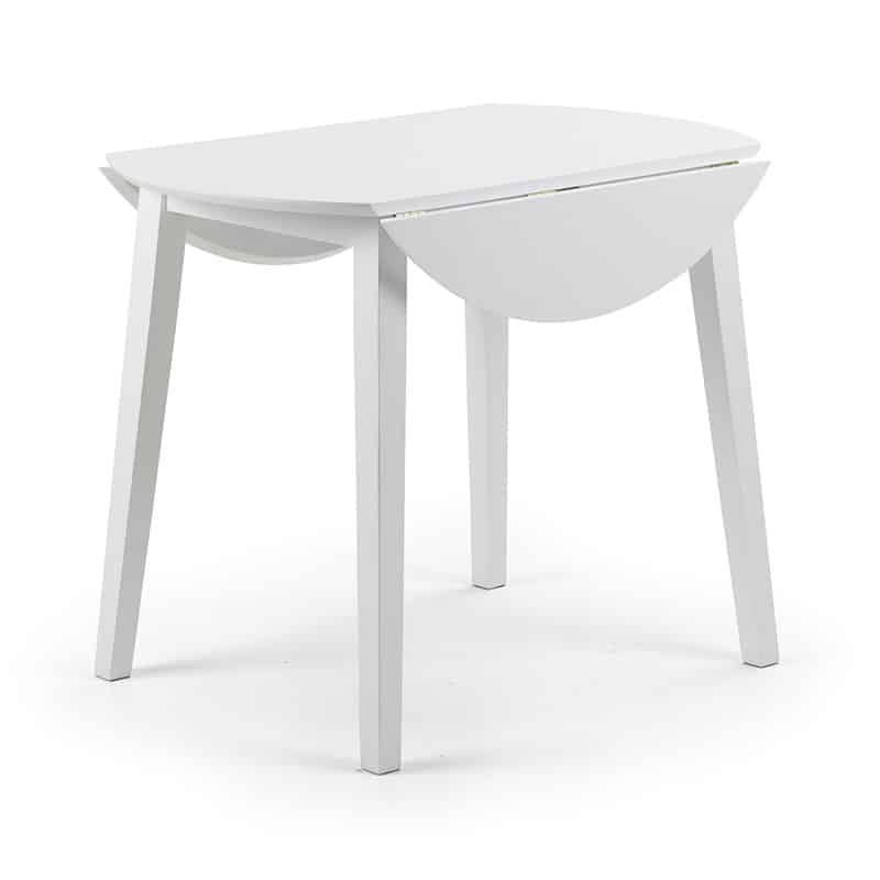 A stylish, double drop leaf round dining set in an immaculate white lacquered finish. Its clean, crisp look fits seamlessly with both traditional and contemporary decor. Featuring high-backed dining chairs with a padded ivory microsuede seat, this dining set is the perfect space saving addition for a smaller room.