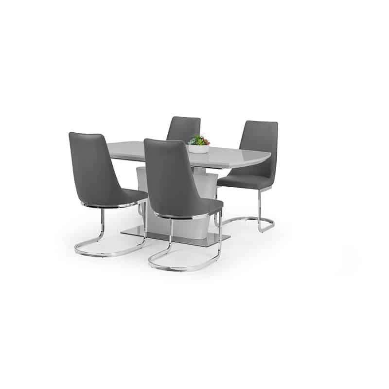 The Como extending dining table is a sleek, modern design finished in a crisp white high gloss with a sturdy chrome pedestal base. This spacious table features a butterfly extension system that is easy to use and stores within the table when not in use, comfortably seating up to 6 people. This striking dining table will be a lasting style statement in any dining room. Featured with 4 Como cantilever dining chairs upholstered in a grey faux leather to complete the glamorous look, the Como Cantilever dining chair offers luxurious comfort with the addition of class and sophistication to any dining room decor.