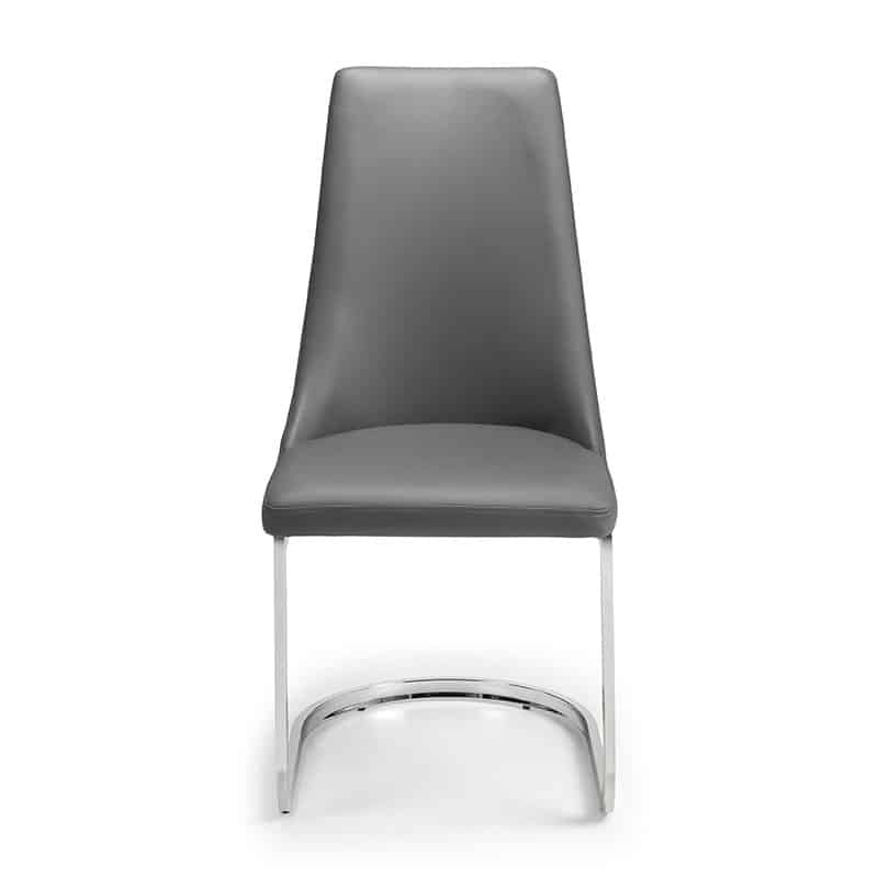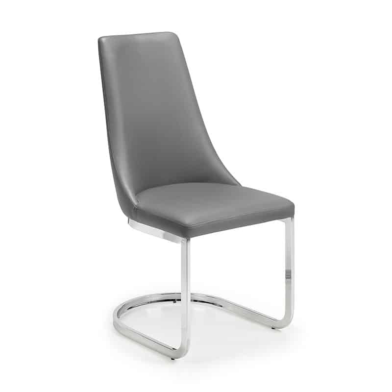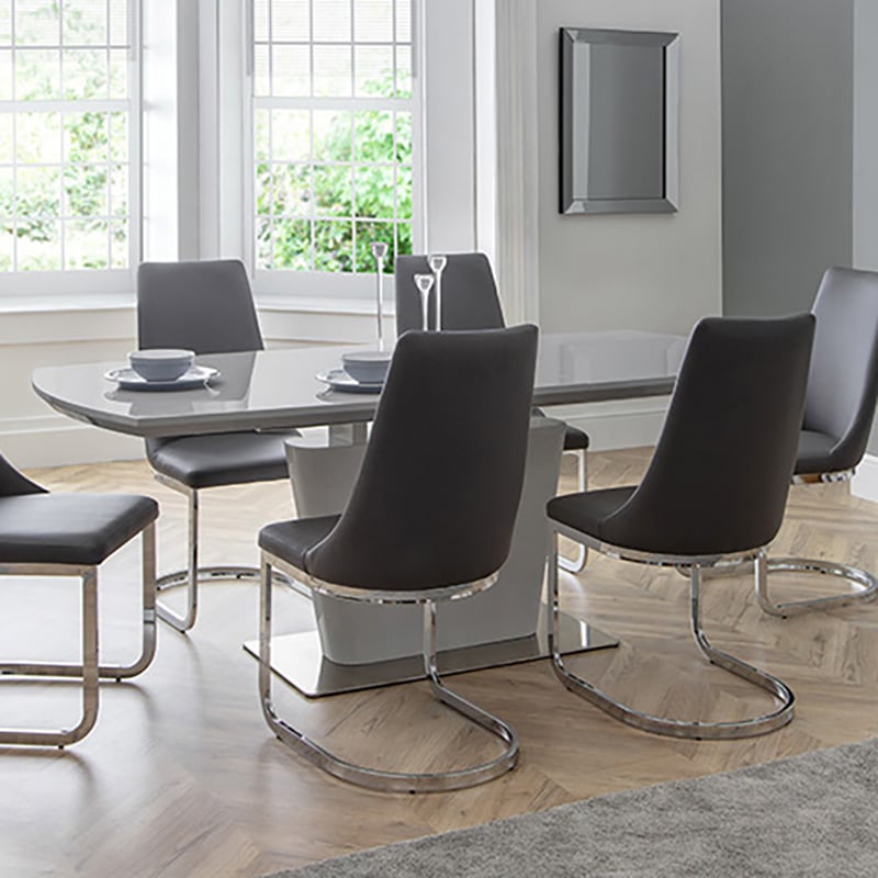 The Como extending dining table is a sleek, modern design finished in a crisp grey high gloss with a sturdy chrome pedestal base. This spacious table features a butterfly extension system that is easy to use and stores within the table when not in use, comfortably seating up to 6 people. This striking dining table will be a lasting style statement in any dining room. Featured with 6 Como cantilever dining chairs upholstered in a grey faux leather to complete the glamorous look, the Como Cantilever dining chair offers luxurious comfort with the addition of class and sophistication to any dining room decor.