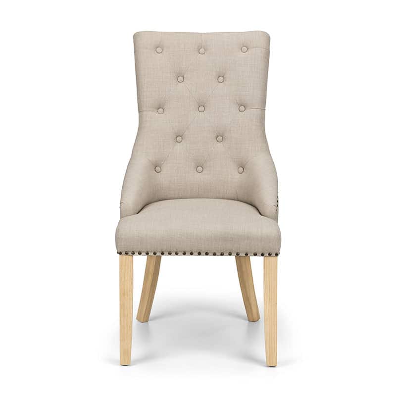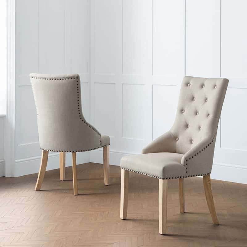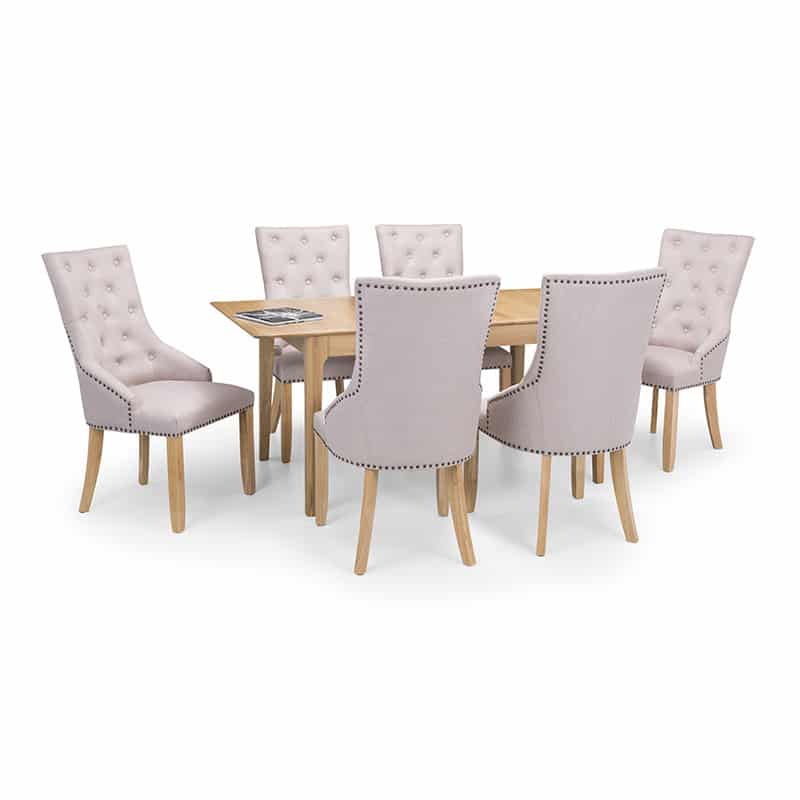 Extending from 140cm to 180cm, the Cotswold Dining Table spaciously seats up to 6 people. Crafted from solid oak and oak veneers, the Cotswold highlights the natural beauty of the wood through the grain creating a traditional style with a clean and simple design. This set includes 6 Loire Dining Chairs upholstered in a luxurious oatmeal linen fabric, featuring elegant deep buttoning and a metal stud trim.
