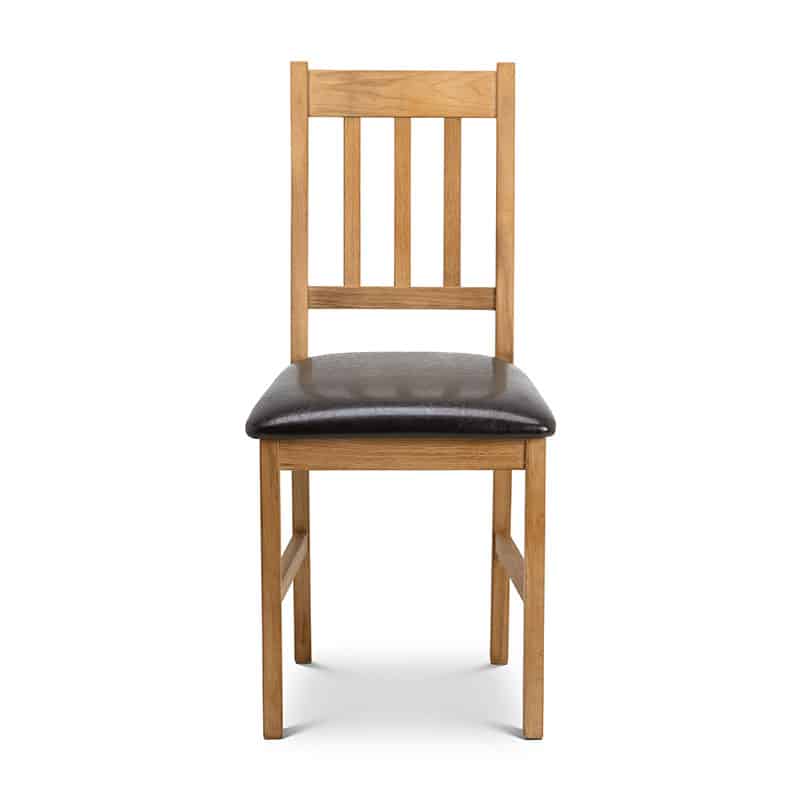 - Solid White Oak Dining Chairs in a durable oiled finish and featuring a padded brown faux leather seat.