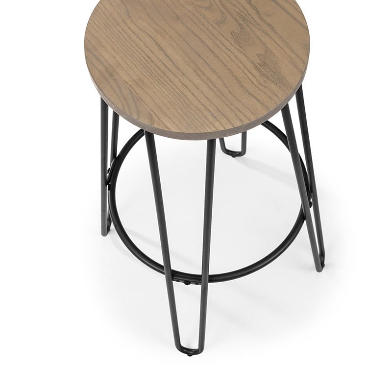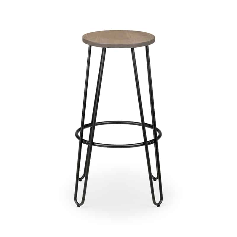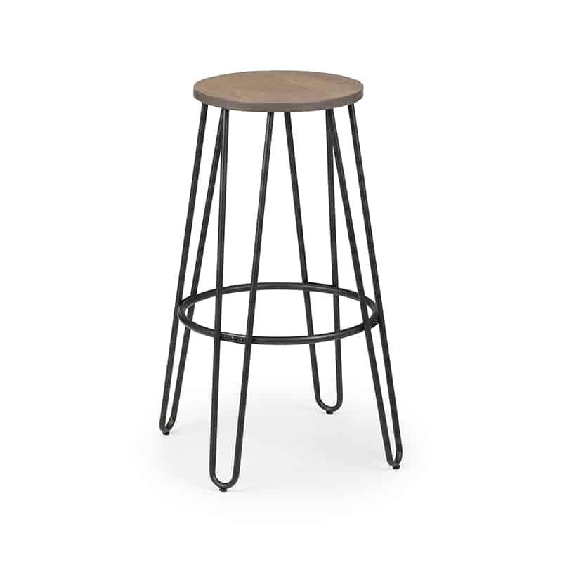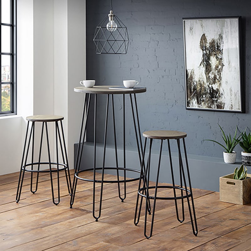 The Dalston Round Bar Table features hair pin legs giving a modern, industrial look to any room. Crafted from solid Elm wood and Satin Black powder coated steel, this bar table offers a durable, sturdy space-saving construction. Paired up with 2 Dalston Bar Stoosl featuring hair pin legs giving a modern, industrial look to any room. Crafted from solid Elm wood and Satin Black powder coated steel, this bar stool offers a durable, sturdy space-saving construction.