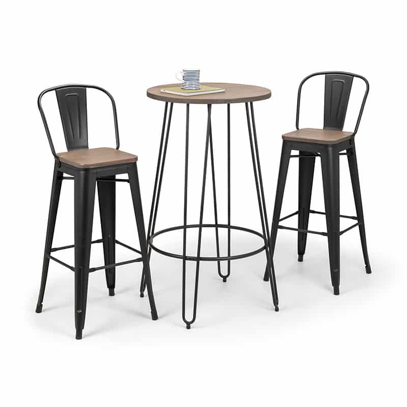 The Dalston Round Bar Table features hair pin legs giving a modern, industrial look to any room. Crafted from solid Elm wood and Satin Black powder coated steel, this bar table offers a durable, sturdy space-saving construction. Paired up with 2 Grafton Bar Stools, featuring an open curved back for extra comfort, adding an industrial touch to any room.