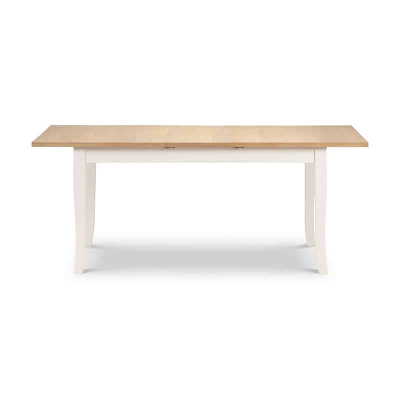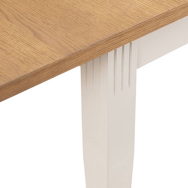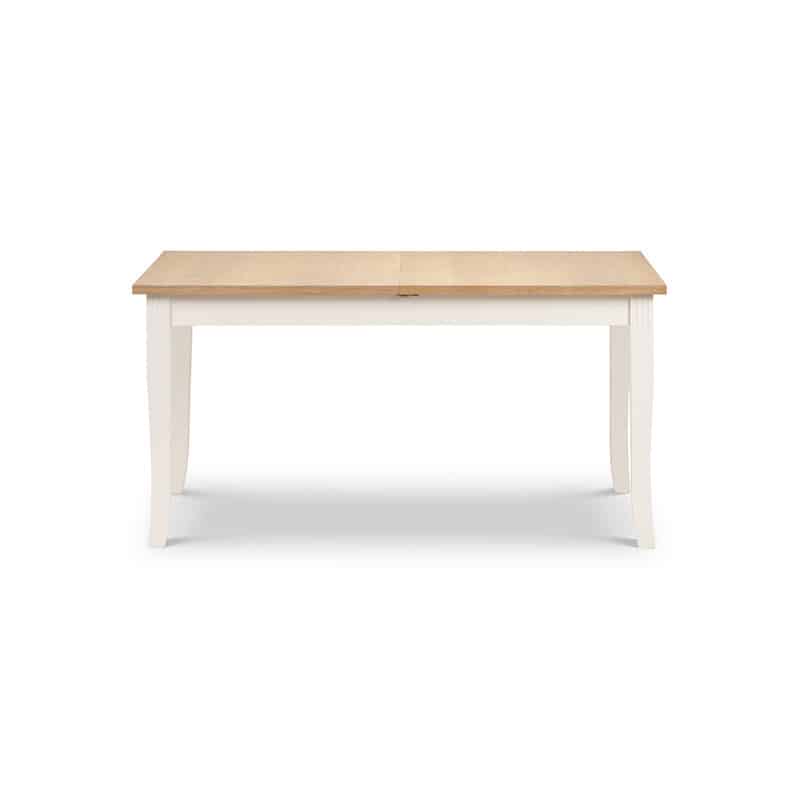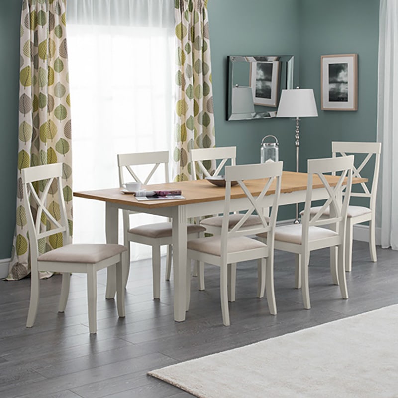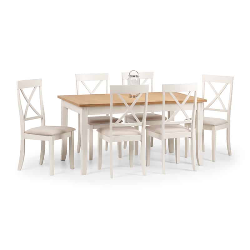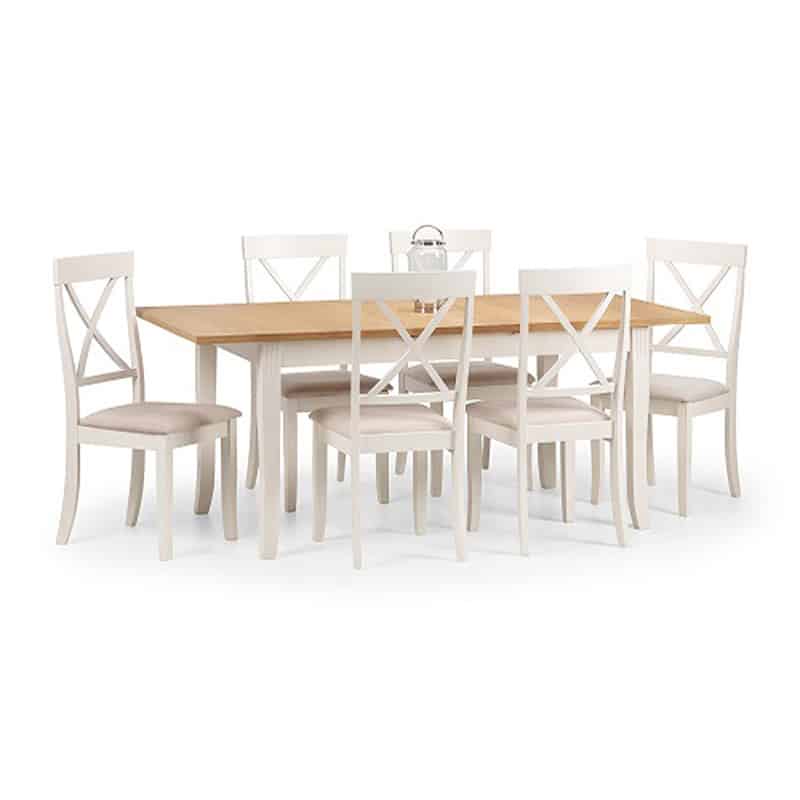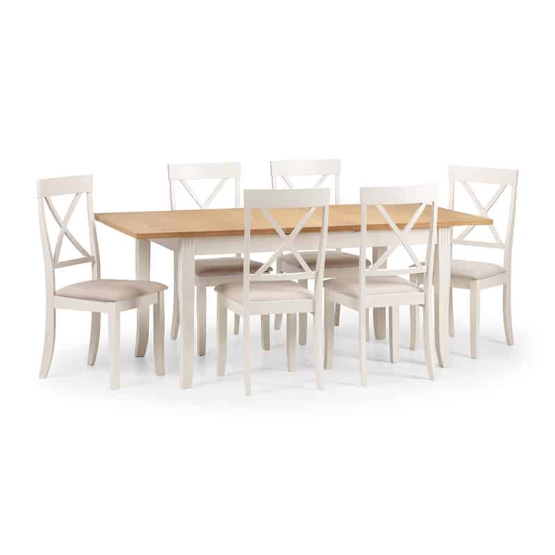 Crafted from solid rubberwood and a real oiled oak veneer 25mm top, this dining table is perfect for having dinner guests. An elegant ivory finish allows the Davenport table to match a wide range of décor, as well as brining a touch of elegance. Featuring a butterfly extension system that is easy to use and stores within the table when not in use, creating more space for your guests when needed. Accompanied by 6 Davenport Dining Chairs. A wide range of coordinating items are available in the Julian Bowen Davenport collection.