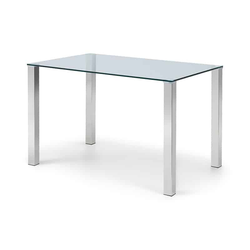 The Enzo is a contemporary and compact chrome and tempered glass dining table that is perfect for modern living. The clean and crisp finish forms a versatile look that fits with a variety of different dining chair styles. The modern Calabria Dining Chairs offering an elegant touch to any dining area. Upholstered in a choice of grey or blue rich velvet, with delicate diamond stitching upon a high, curved back rest for added comfort. Finished with a chrome plated cantilever frame, this dining chair perfectly suits the Enzo table.