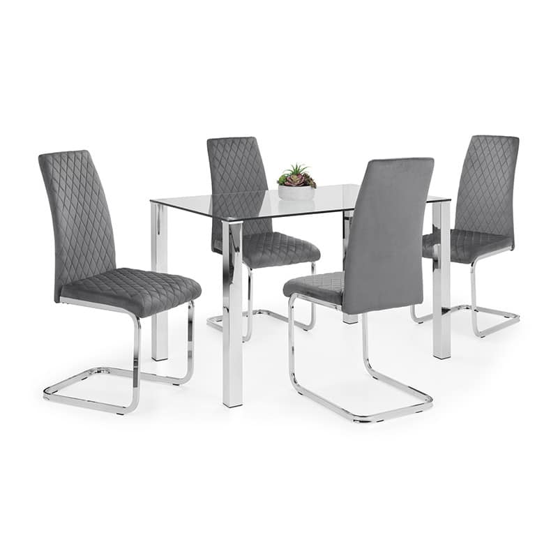 The Enzo is a contemporary and compact chrome and tempered glass dining table that is perfect for modern living. The clean and crisp finish forms a versatile look that fits with a variety of different dining chair styles. The modern Calabria Dining Chairs offering an elegant touch to any dining area. Upholstered in a choice of grey or blue rich velvet, with delicate diamond stitching upon a high, curved back rest for added comfort. Finished with a chrome plated cantilever frame, this dining chair perfectly suits the Enzo table.