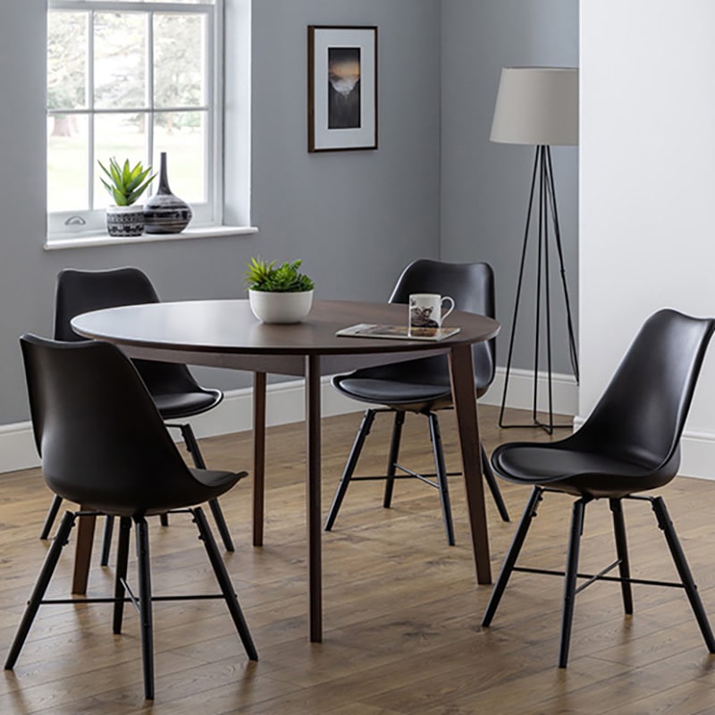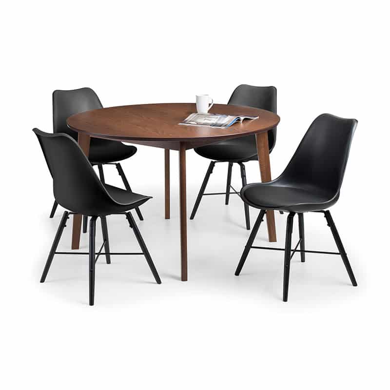 The Farringdon round dining table offers a timeless, functional accent to your home. Bringing warmth to any dining room, perfect for a mix of modern or traditional decor. Crafted from walnut effect foil wrap, this rich coloured dining table highlights the natural beauty of the grain. Featured with 4 Kari dining chairs. The Kari Dining Chair features a curved design that conforms to the natural curve of the spine, paired with a high-quality padded seat allowing you to reach maximum comfort. Featuring a black, easily-cleaned seat and black legs, with a steel cross bar giving this chair a modern industrial feel.