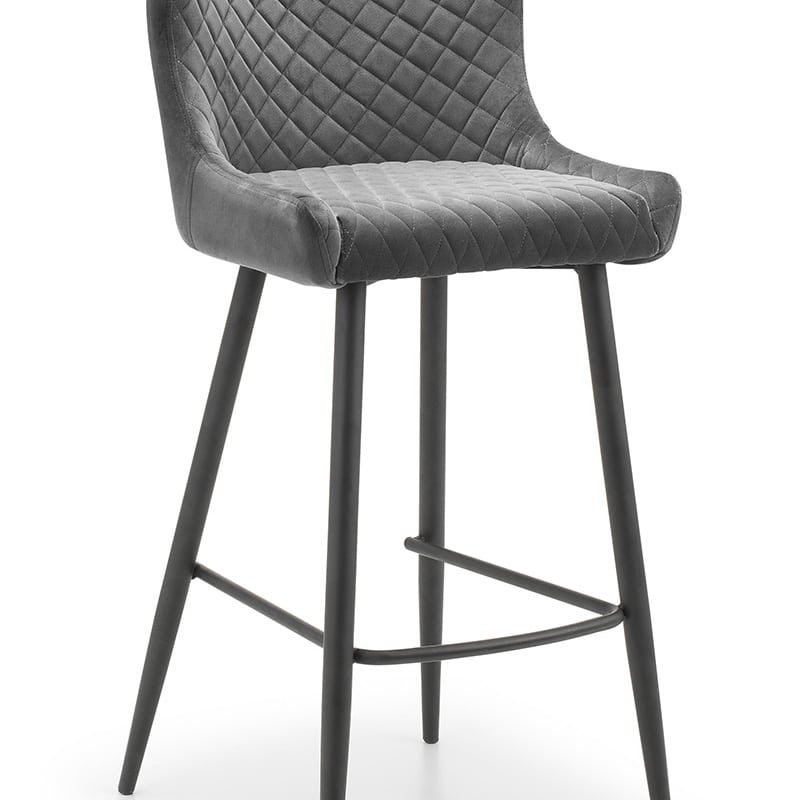Crafted from solid Elm wood and satin black powder coated steel, The Grafton Bar Table offers a suitable dining or drinking area for up to 4 people. Paired up with 4 striking Luxe Grey Velvet Bar Stools, with luxurious quilted stitching, adding a modern, industrial feel to any room.