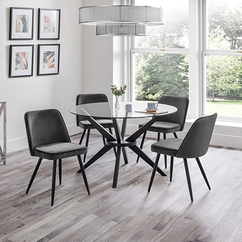 The Hayden Round Table combines a sleek, tempered glass top with a contemporary black solid Beech base to create a statement look in your home. Perfect for drinks, dinner, or catching up with friends over a coffee, Hayden is a versatile piece that suits various styles of décor. Featured with 4 Burgess grey chairs.