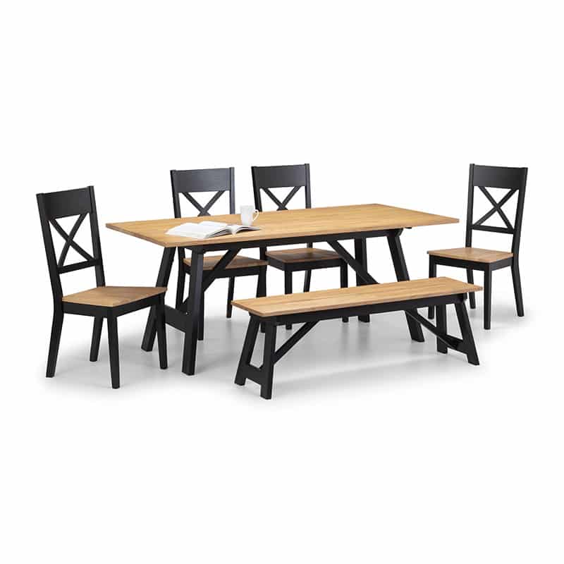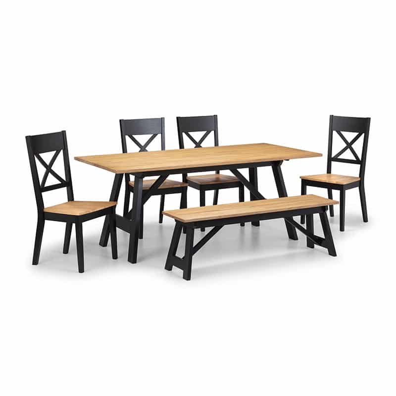 Featuring a 25mm rubberwood top, the Hockley dining table displays the natural colour and unique grain of the wood. A contrasting painted black rubberwood frame allows this dining table to be suitable for a wide range of décor. Accompanied by the Hockley Bench and 6 Hockley Dining Chairs, featuring a 25mm rubberwood top, the Hockley dining chair displays the natural colour and unique grain of the wood. A contrasting painted black rubberwood frame allows this dining table to be suitable for a wide range of décor.