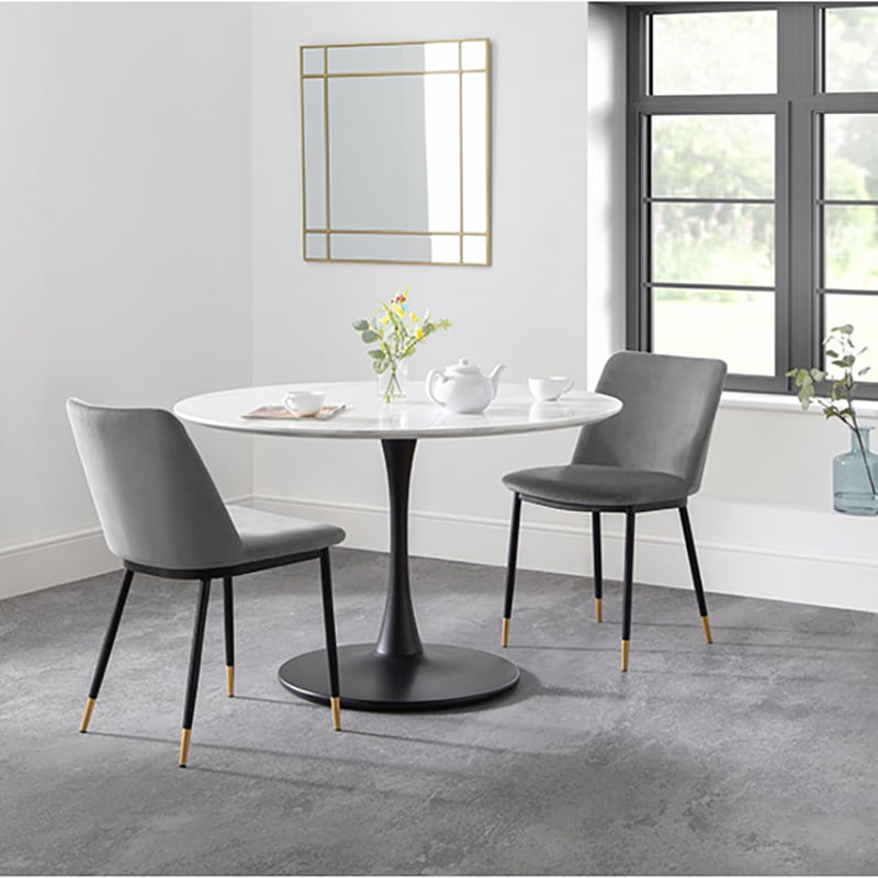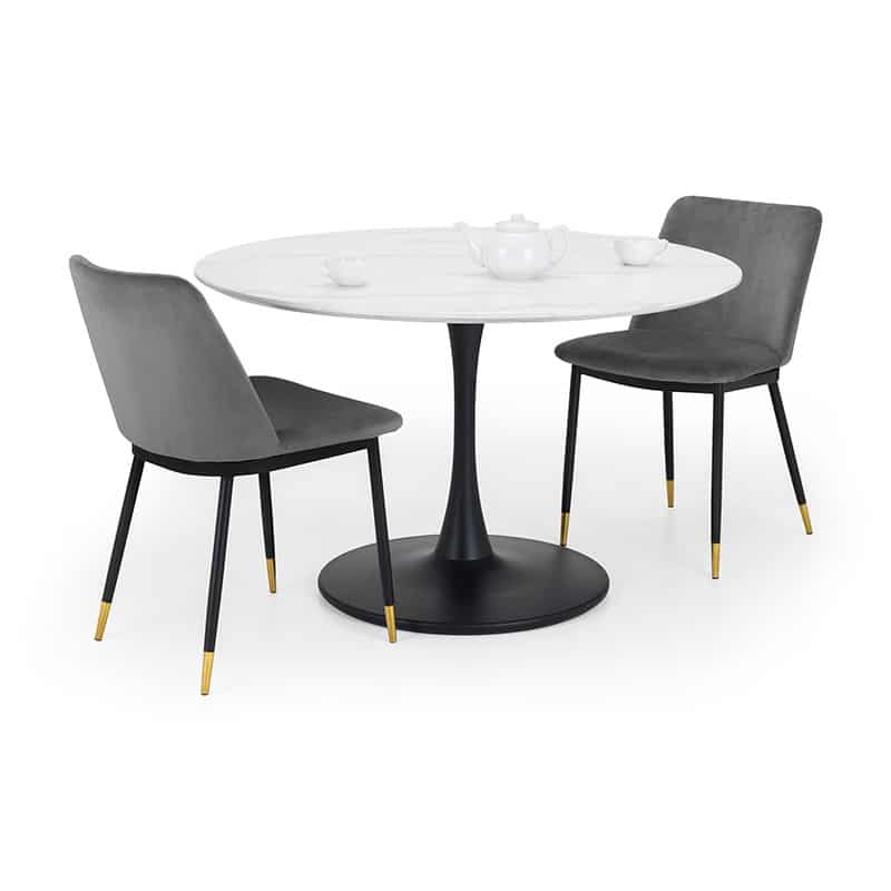 The Holland would be a stunning addition to any smaller dining environment. With its on-trend monochrome palette and showstopping marble finish, it will add a touch of glamour wherever it’s placed. Paired with 2 Delaunay Grey Chairs.
