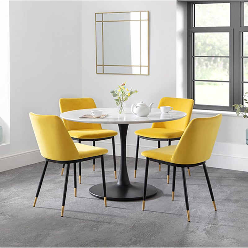 The Holland would be a stunning addition to any smaller dining environment. With its on-trend monochrome palette and showstopping marble finish, it will add a touch of glamour wherever it’s placed. Paired with 4 Dealuanay Mustard Chairs.
