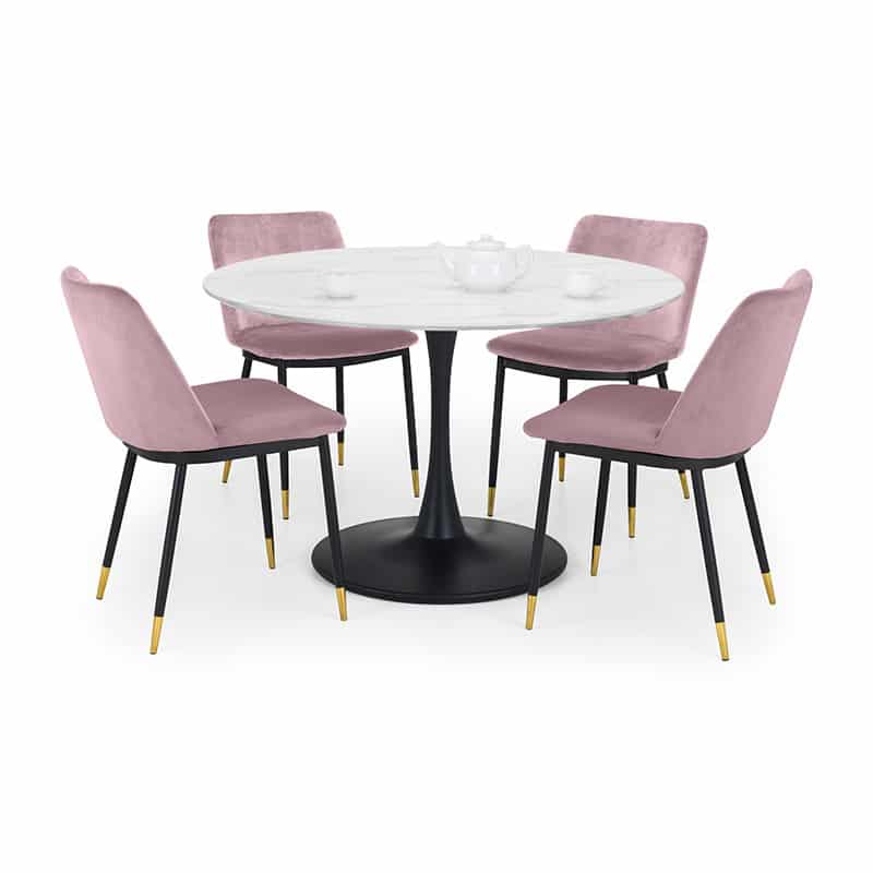 The Holland would be a stunning addition to any smaller dining environment. With its on-trend monochrome palette and showstopping marble finish, it will add a touch of glamour wherever it’s placed. Paired with 4 Delaunay Pink Chairs.