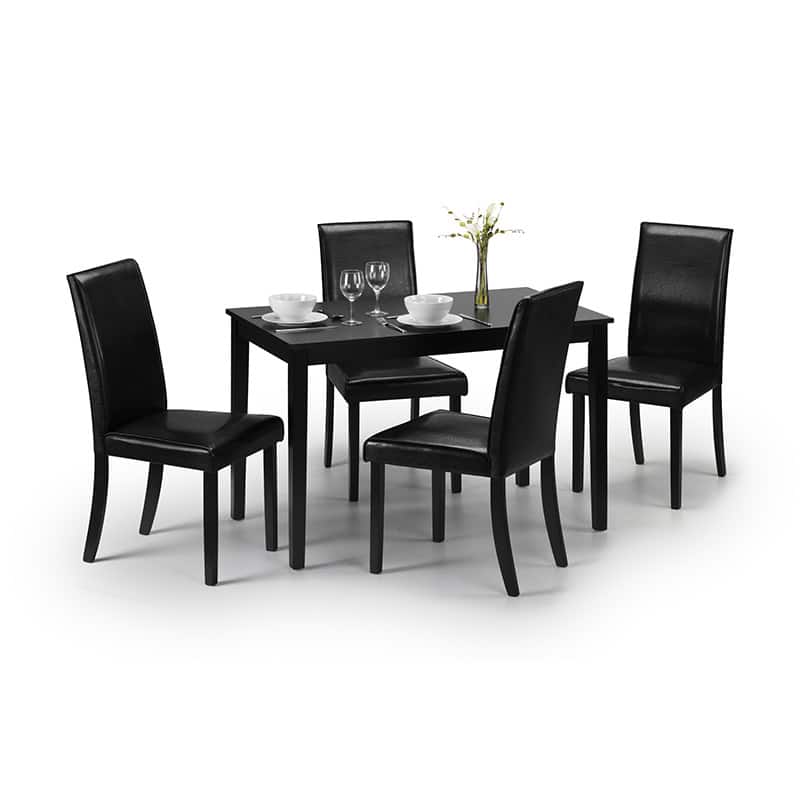 Simple, space saving design meeting the requirements of the modern domestic home. The Hudson dining set is consists of a laquered rubberwood and MDF dining table, along with four upholsetered faux leather chairs. Finished in a block black colour, this dining set coordinates with a wide range of decor.
