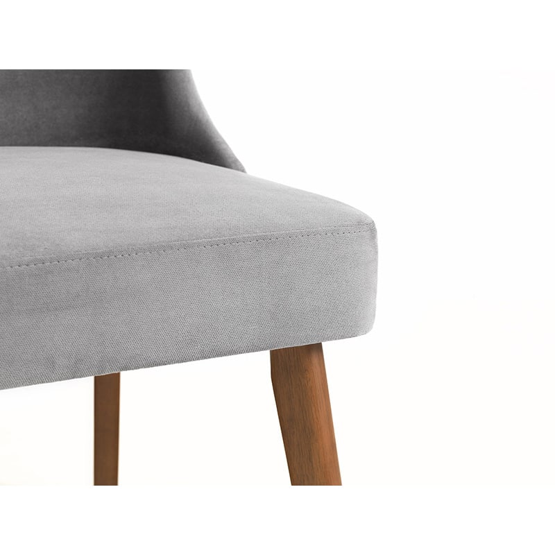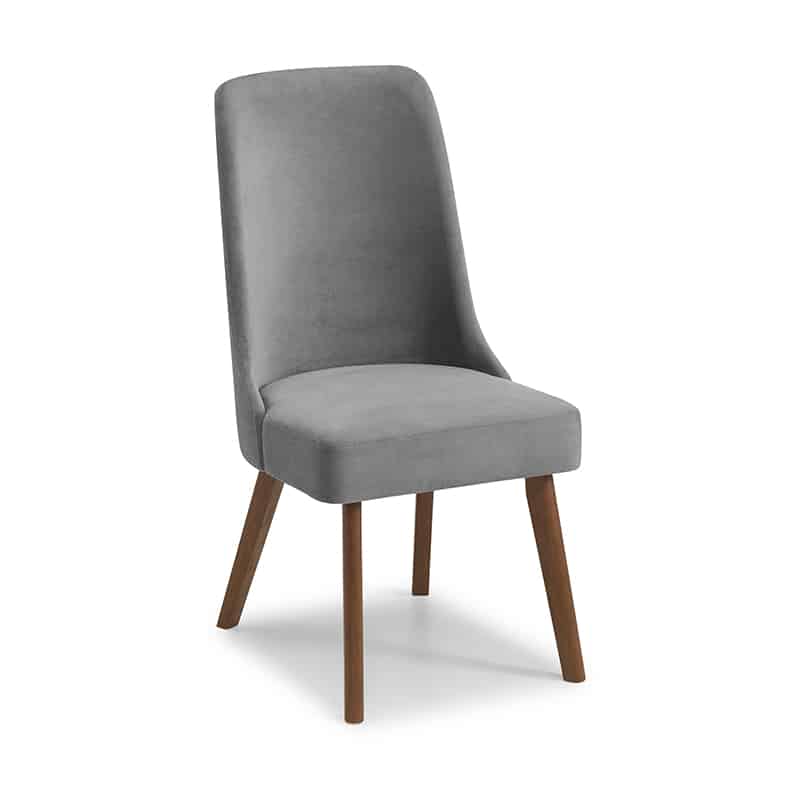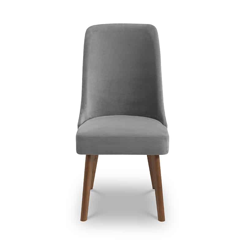 The Huxley round dining table is a contemporary design, with a traditional influence. Bringing warmth to any dining room, perfect for a mix of modern or traditional decor. Crafted from walnut veneer, this rich coloured dining table excels in stability. Accompanied by 4 Huxley Dining Chairs.The Huxley Dining Chair features a glamourous curved back, with modern tapered walnut legs. Finished in dusk grey chenille fabric, this dining chair adds a touch of elegance to any dining area