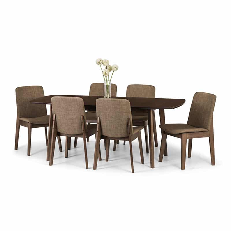 A truly stunning walnut finish dining table crafted from solid beech and beech veneers. Its sleek, modish design adds a real wow factor to any dining room, while an easy to use extending leaf means that it also offers exceptional practicality. Paired with the Kensington chairs in Cappuccino Linen effect fabric that are ergonomically formed and padded for a very comfortable sit.