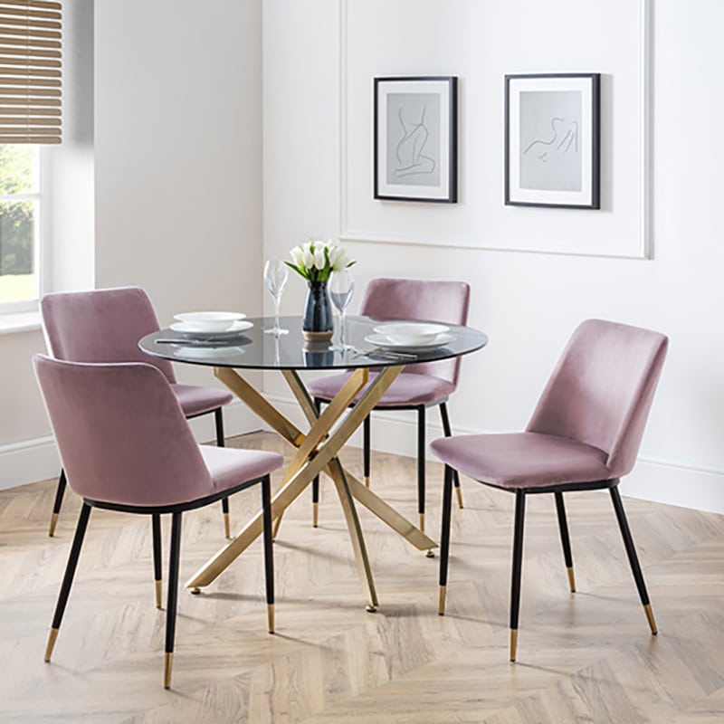 Montero is a strikingly elegant dining table which combines gold metal and glass to create a modern and stylish aesthetic. The intertwined legs leave a unique look which also provide a sturdy support for the table – paired with the Delaunay Dining Chairs, this set creates a beautifully contemporary, classic look in your dining space.