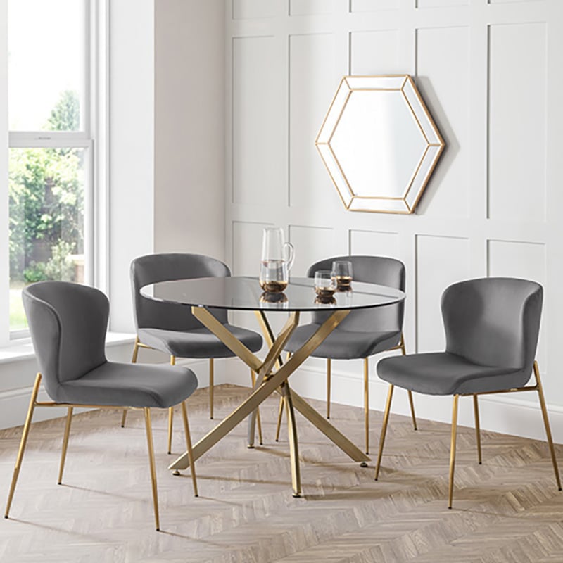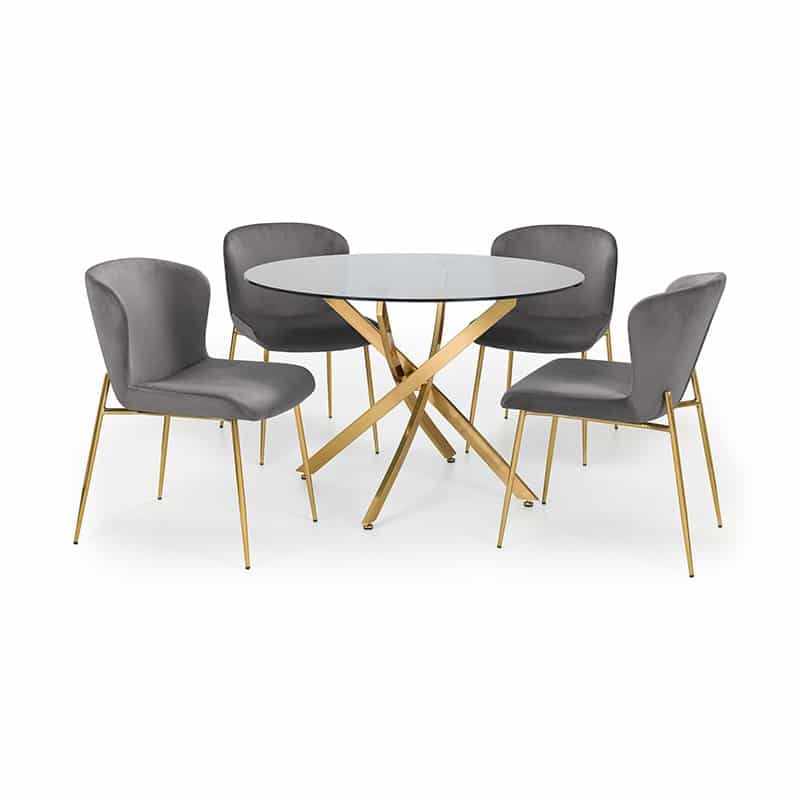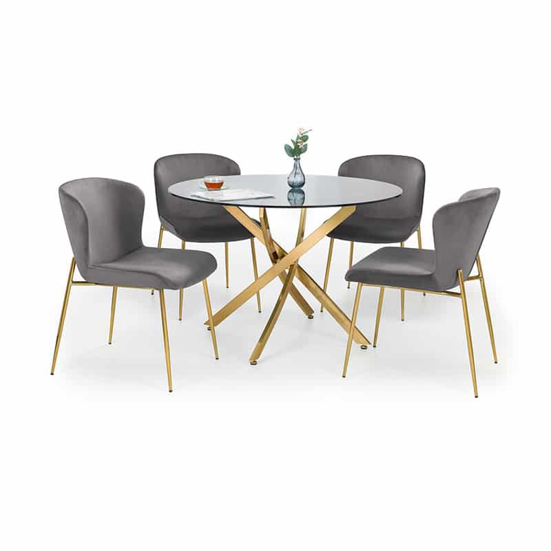 Montero is a strikingly elegant dining table which combines gold metal and glass to create a modern and stylish aesthetic. The intertwined legs leave a unique look which also provide a sturdy support for the table – paired with the Harper Dining Chairs, this set creates a beautifully contemporary, classic look in your dining space.