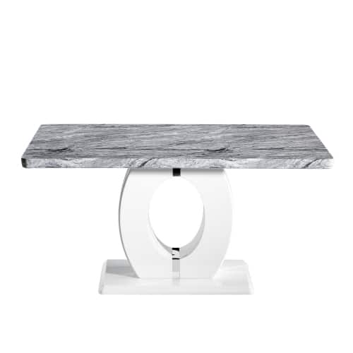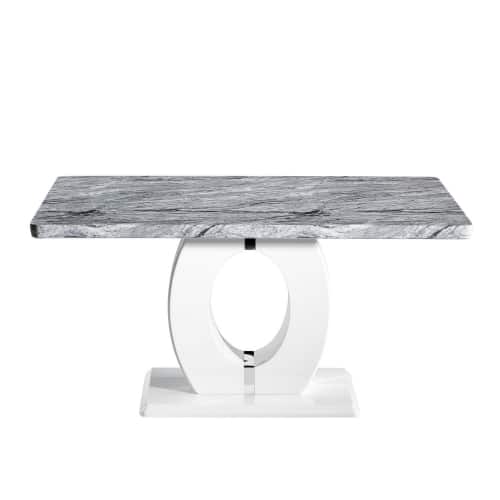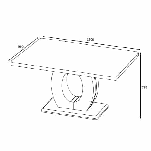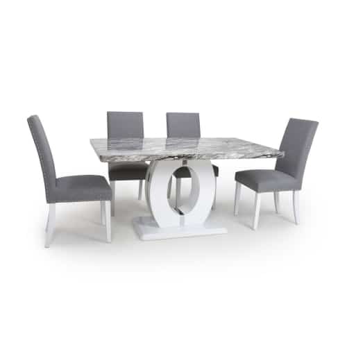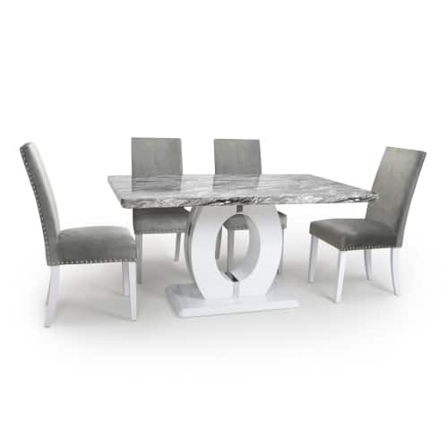This stunning 1.5-metre dining set is a perfect blend of classical and contemporary design. The marble-effect top is offset by a unique white high-gloss circular base with chrome trim detailing. The table is complemented by four stud-detailed dining chairs, upholstered in silver-grey linen-effect fabric with white rubberwood legs.