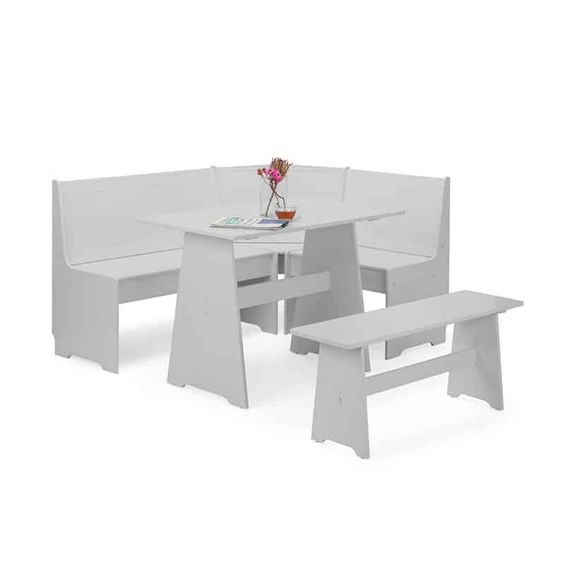 The corner design provides a cozy, intimate place for friends and family to gather and enjoy meals together. The slightly curved shape fits nicely around a corner while the bench offers a more casual place to perch. The grey finish helps keep the space feeling light and airy, even in a smaller area.