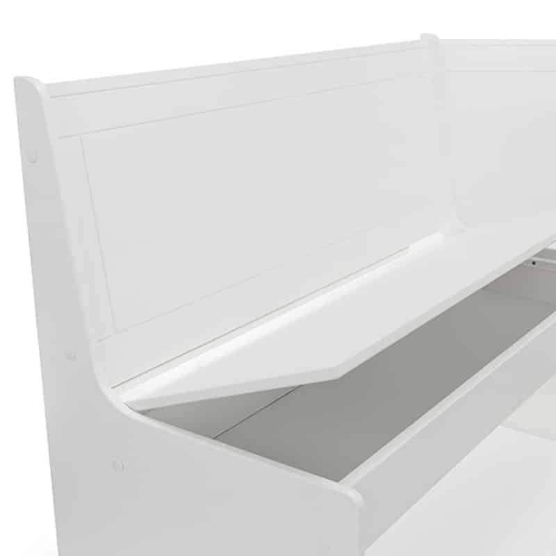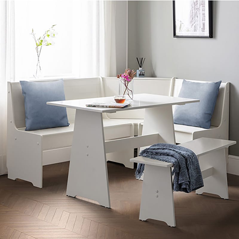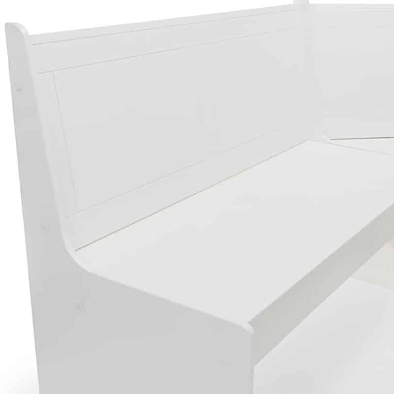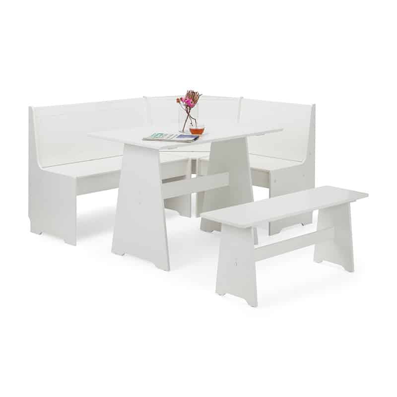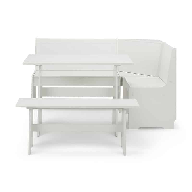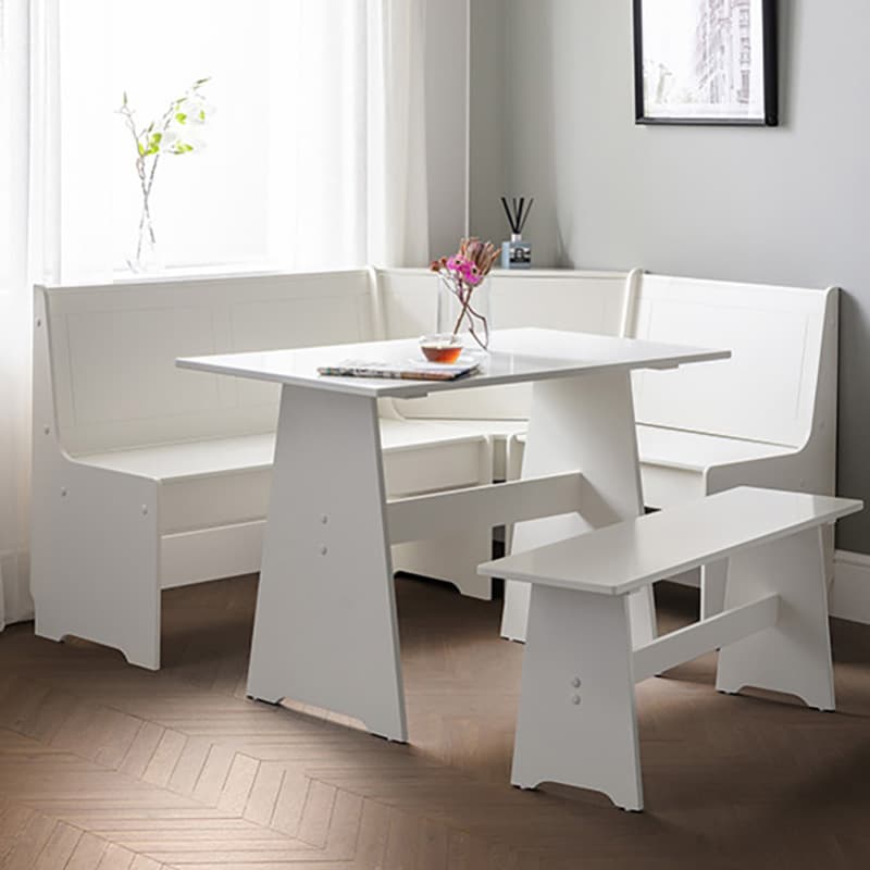 This classic corner design is perfect for any traditional or rustic home. Finished in a fresh surf white lacquer, the Newport corner dining set features high seatbacks and a bench with a classic, eye-catching design. This dining set is perfect for any kitchen or dining room with a small area.