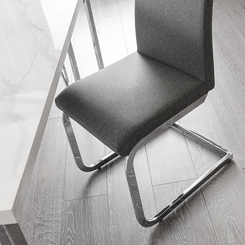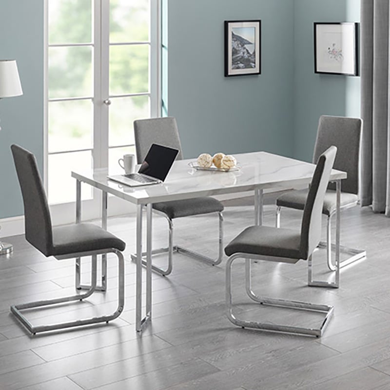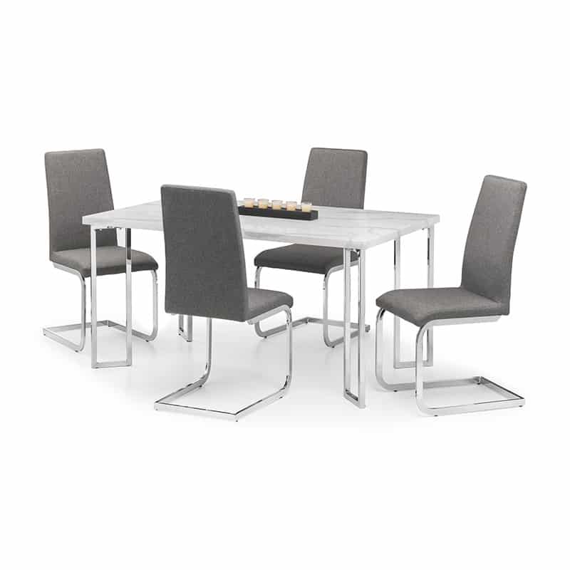 The Positano is crafed from a sleek marble effect top on a stainless steel frame. Featuring individual angled framed legs which give off a futeristic feel. It has a timeless Italian design that fits well with a wide range of decorative styles. Accompanied by 4 Roma Chairs. The Roma cantilever dining chair offers the ultimate combination of comfort and style. A contemporary slate grey linen seat is perfectly complemented by a beautifully designed chrome base to create a modish chair that beautifully accompanies the Positano dining table.