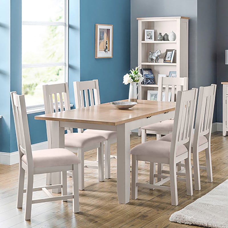 This imposing dining table features a substantial 30mm top and a 40cm butterfly extension system that is easy to use and stores within the table when not in use. The elegant dining chair is upholstered in a chic taupe coloured linen fabric with foam padding for extra comfort. Part of the extensive Richmond Dining and Occasional furniture range from Julian Bowen.
