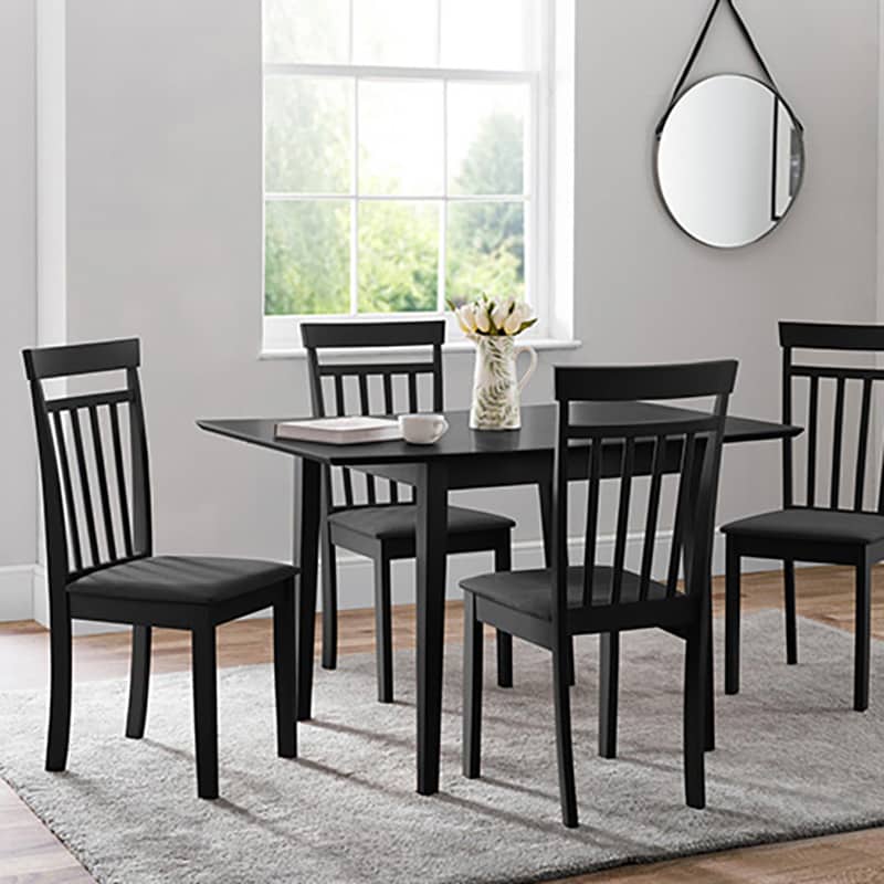 This Rufford 80cm-120cm Extending Dining Table has been constructed from tropical hardwood, and has a Black lacquered finish which leaves a crisp, clean look. The stylish extending dining table incorporates a butterfly extension system, so there is no need to store a separate leaf. This is a great way to save space in your dining room and it is ideal when unexpected guests pop round! Featured with 4 Coast Black Chairs.