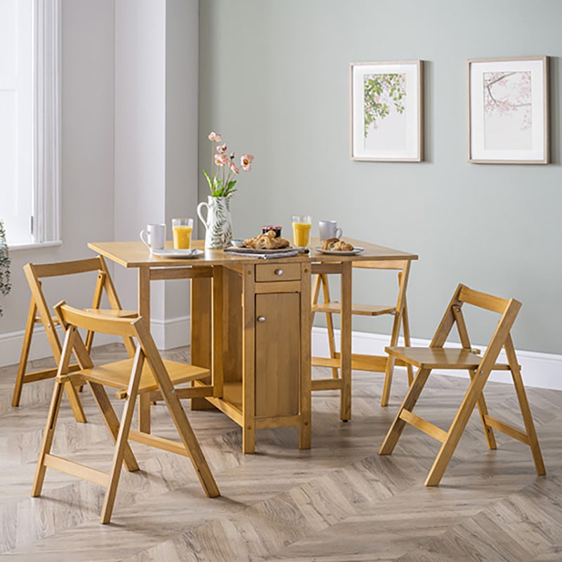 A neat and functional, space saving dining set where the chairs can be folded and stored Inside the table. This dining set is a timeless classic that features a integrated storage drawer, perfect for small spaces with less storage. Available in a white and natural finish and an all over light oak finish.