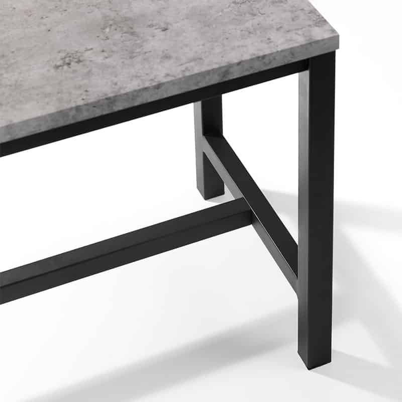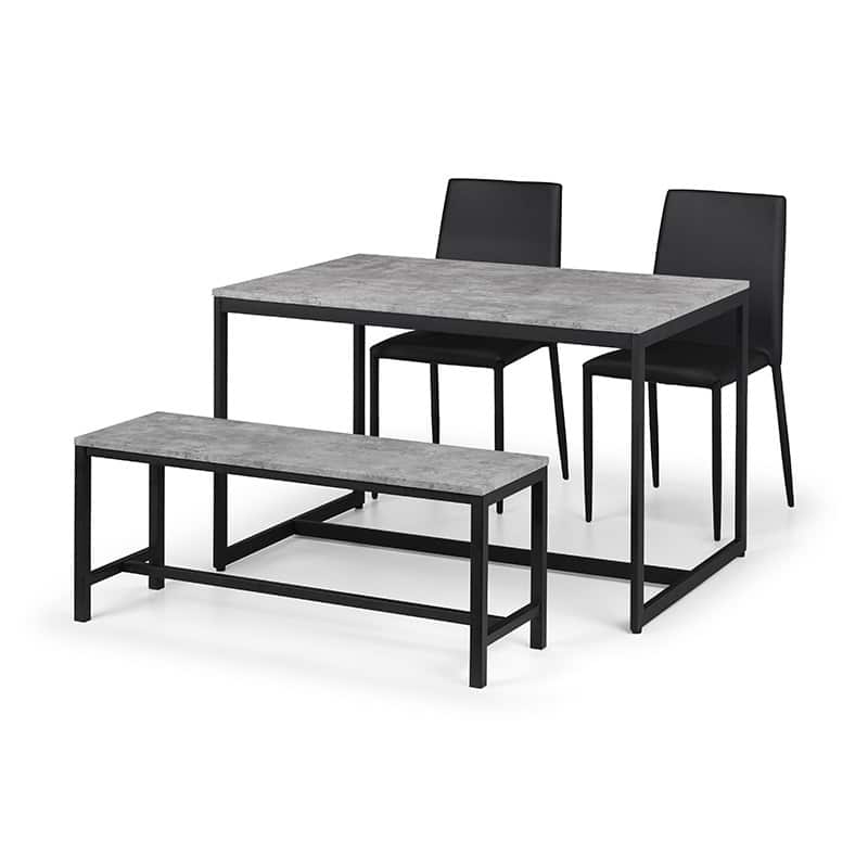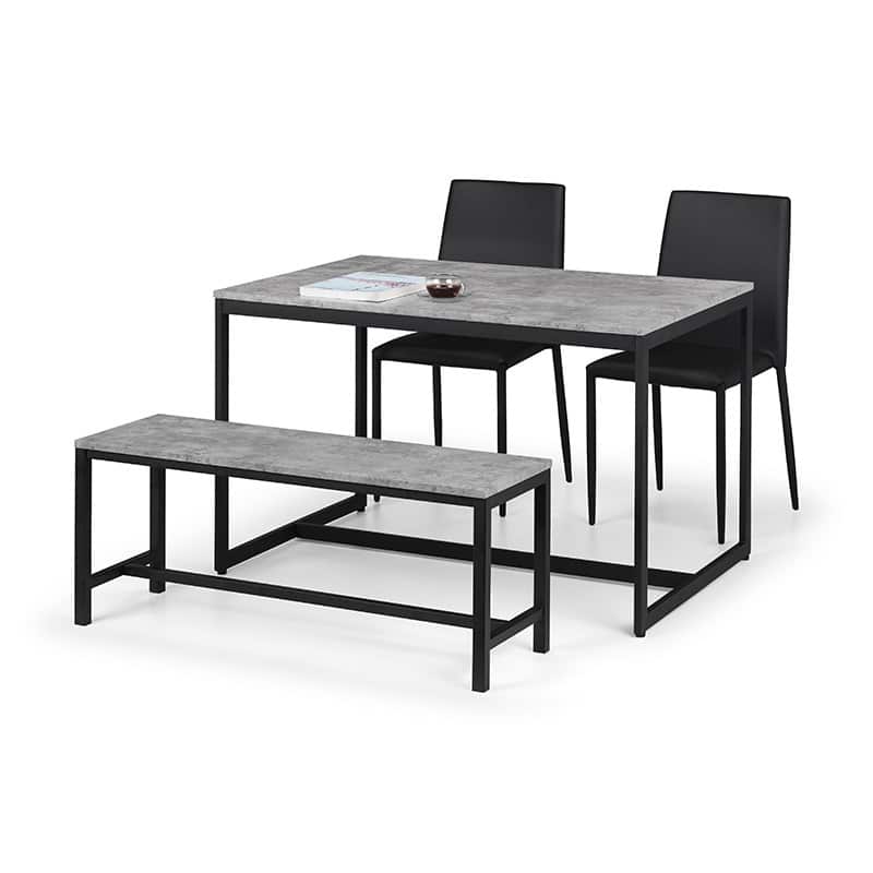Simplistic in design with a contemporary style, the Staten dining table will add a stunning industrial look to any living and dining area. Constructed from a black coated metal frame, complemented by a striking concrete effect tops, to create a very stylish, modern product. Featured with the Staten bench and 2 Jazz black dining chairs. Our modern styled Jazz chair has great comfort and stacks away for compact storage. Crafted from a steel frame with foam and fabric upholstery, providing you maximum comfort and durability.