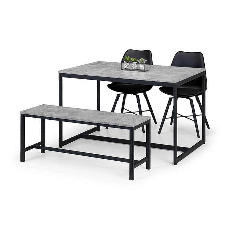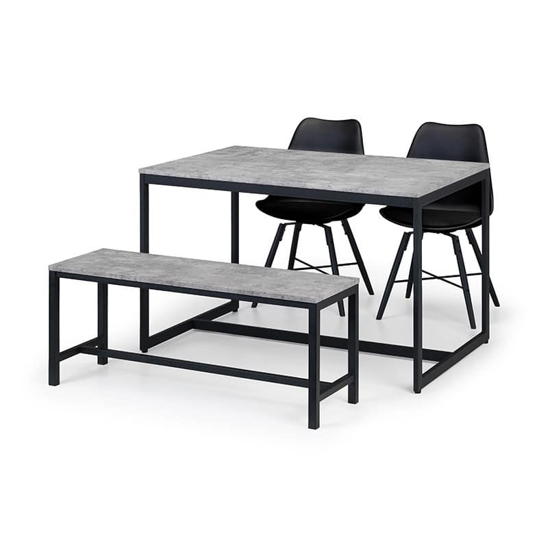 Simplistic in design with a contemporary style, the Staten dining table will add a stunning industrial look to any living and dining area. Constructed from a black coated metal frame, complemented by a striking concrete effect tops, to create a very stylish, modern product. Featured with the Staten bench and 2 Kari black dining chairs. The Kari Dining Chair features a curved design that conforms to the natural curve of the spine, paired with a high-quality padded seat allowing you to reach maximum comfort. Featuring a black, easily-cleaned seat and black legs, with an steel cross bar giving this chair a modern industrial feel.