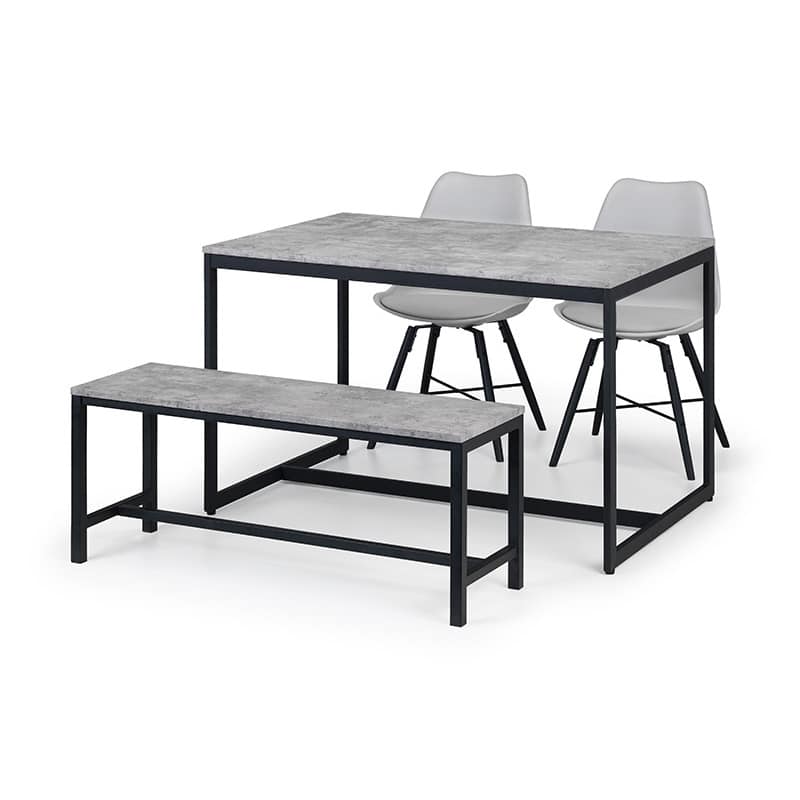 Simplistic in design with a contemporary style, the Staten dining table will add a stunning industrial look to any living and dining area. Constructed from a black coated metal frame, complemented by a striking concrete effect tops, to create a very stylish, modern product. Featured with the Staten bench and 2 Kari grey dining chairs. The Kari Dining Chair features a curved design that conforms to the natural curve of the spine, paired with a high-quality padded seat allowing you to reach maximum comfort. Featuring a black, easily-cleaned seat and black legs, with an steel cross bar giving this chair a modern industrial feel.