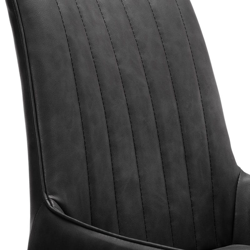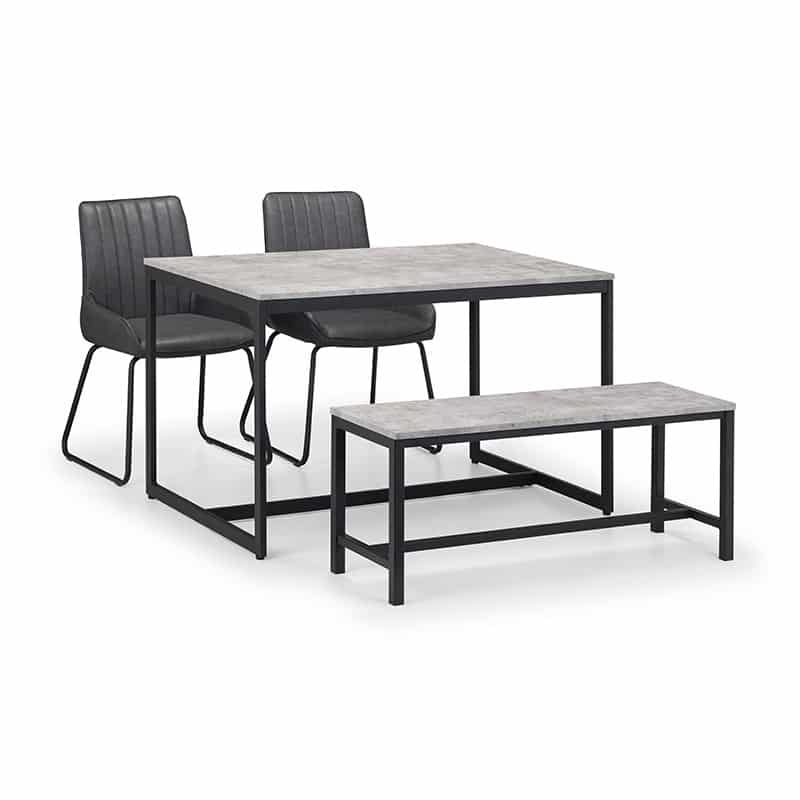 Simplistic in style with a contemporary design, the Staten Dining Table will add a stunning industrial look to any living and dining area. Constructed from a black coated metal frame, complemented by a striking concrete effect tops, to create a very stylish, modern product. Featured with the Staten bench and 2 Soho dining chairs. This Retro Soho Dining Chair is finished in an antique black faux leather with a striking black metal frame, sure to compliment any contemporary décor.