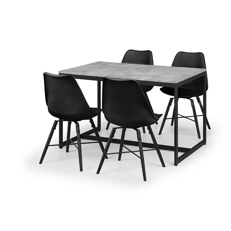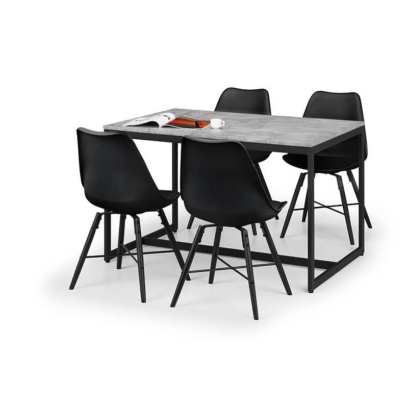 Simplistic in design with a contemporary style, the Staten dining table will add a stunning industrial look to any living and dining area. Constructed from a black coated metal frame, complemented by a striking concrete effect tops, to create a very stylish, modern product. Featured with 4 Kari black dining chairs. The Kari Dining Chair features a curved design that conforms to the natural curve of the spine, paired with a high-quality padded seat allowing you to reach maximum comfort. Featuring a black, easily-cleaned seat and black legs, with an steel cross bar giving this chair a modern industrial feel.